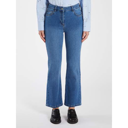 T-shirt da donna girocollo a maniche corte con orlo ripiegato e ricamo viso blu. Un capo moderno e raffinato, perfetto per chi cerca uno stile casual con un tocco di originalità.