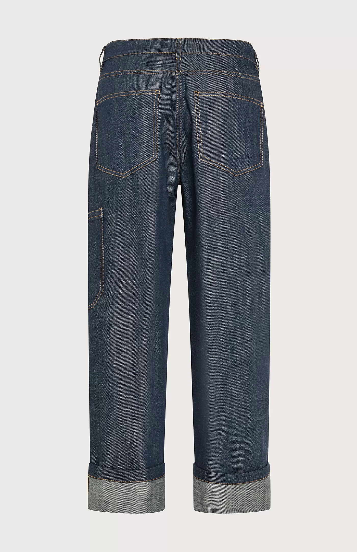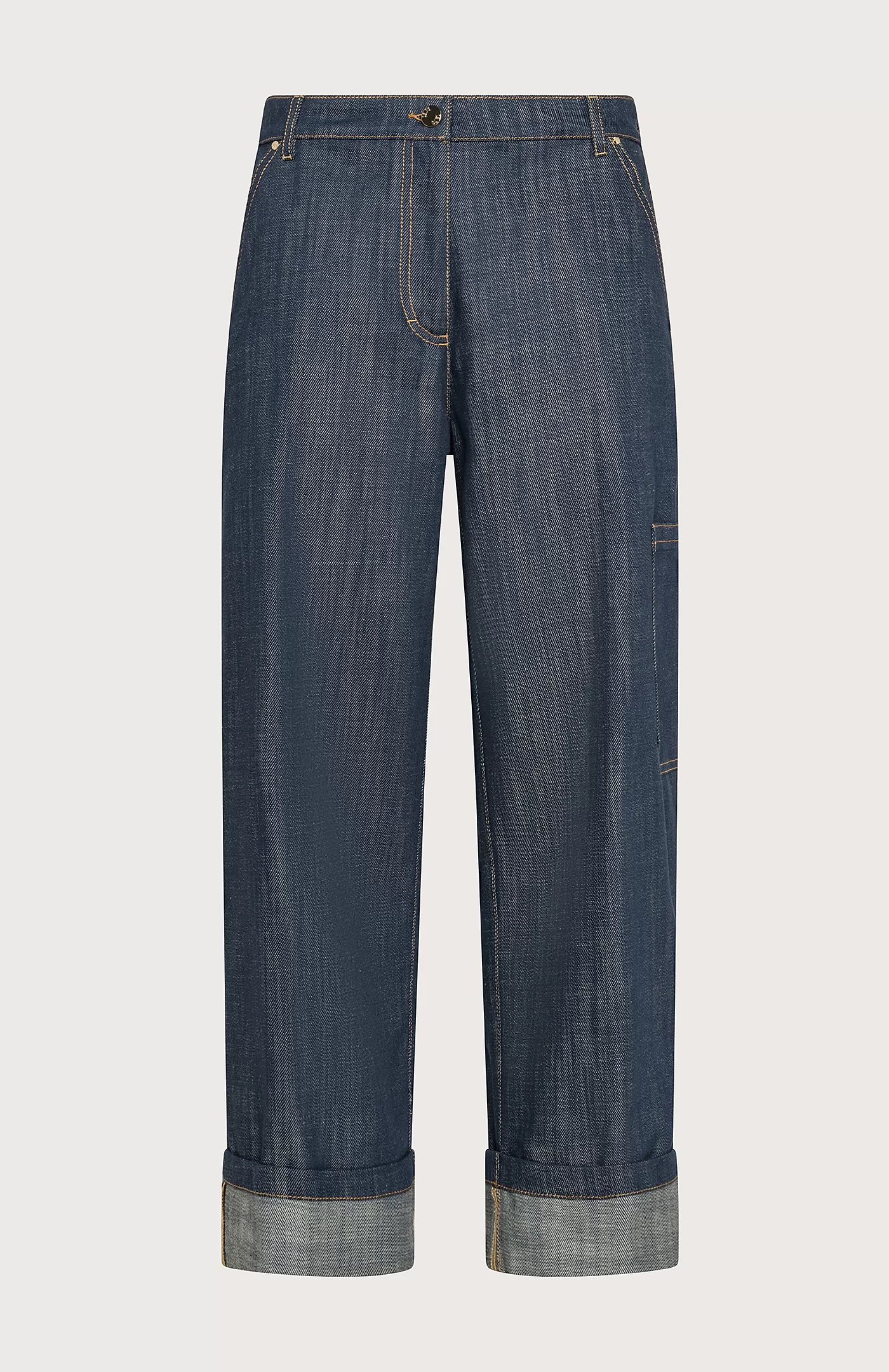 Jeans a gamba dritta e lunghezza alla caviglia in diagonale cotone effetto denim. Tasche a filo sul davanti e tasche a toppa posteriori e laterali. Orlo ripiegato.