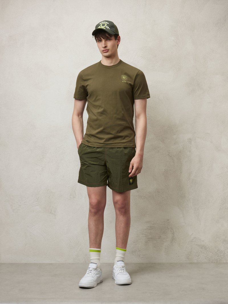 Descrizione: T-shirt uomo a manica corta in jersey di cotone. Girocollo a costina in tono. Stampa nel petto a sinistra con lo scudo Blauer e la scritta NYPD sotto tutto in tono. Tessuto morbido e comodo 100% cotone.