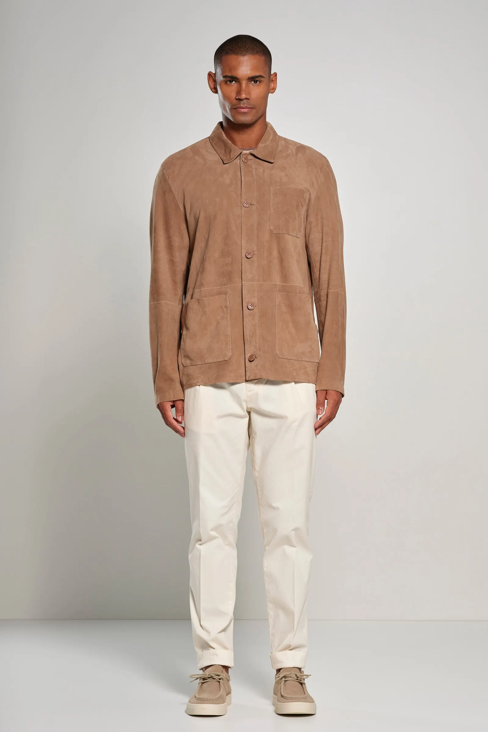 Descrizione: Giacca-camicia da uomo in pelle scamosciata, sfoderata, un capo che unisce personalità e design, perfetto per chi cerca uno stile distintivo e moderno.