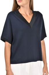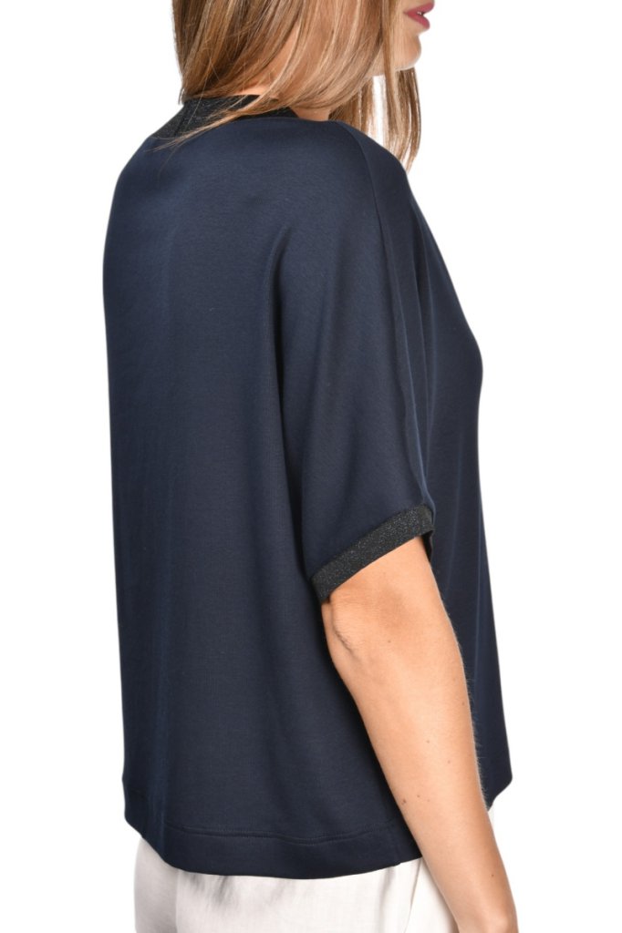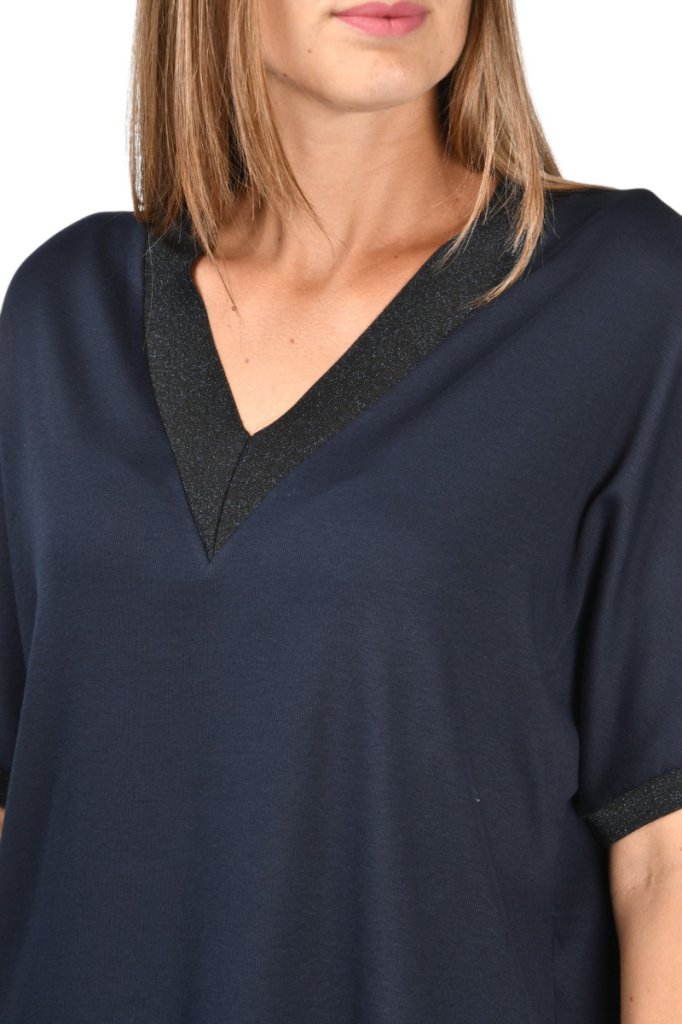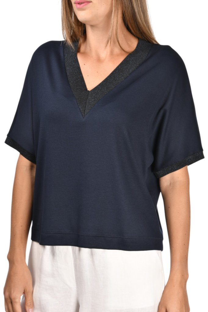 Descrizione: Maglia stretch scollo a V grigio con inserto metallico silver. Maniche corte con profilo grigio e inserto metallico silver. Lavorazione micro costina.