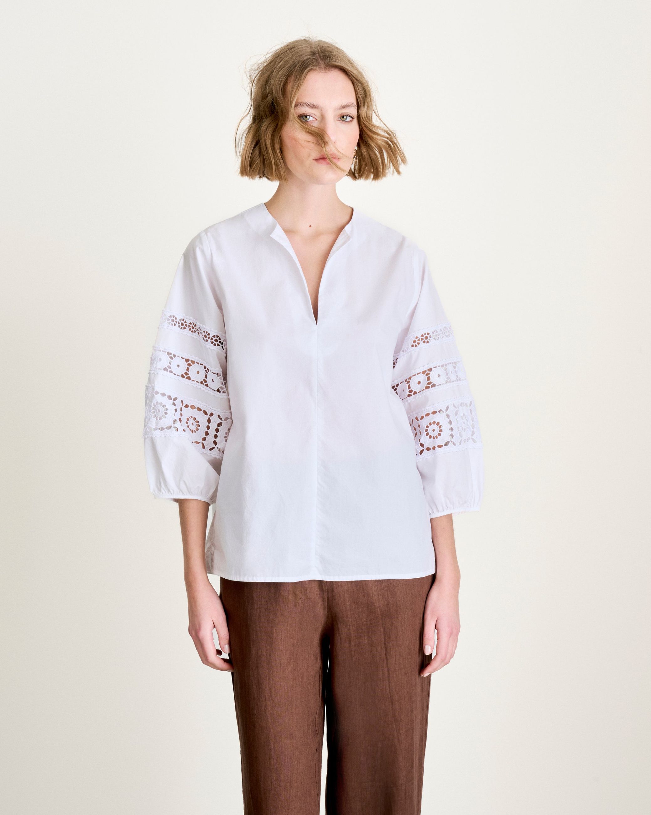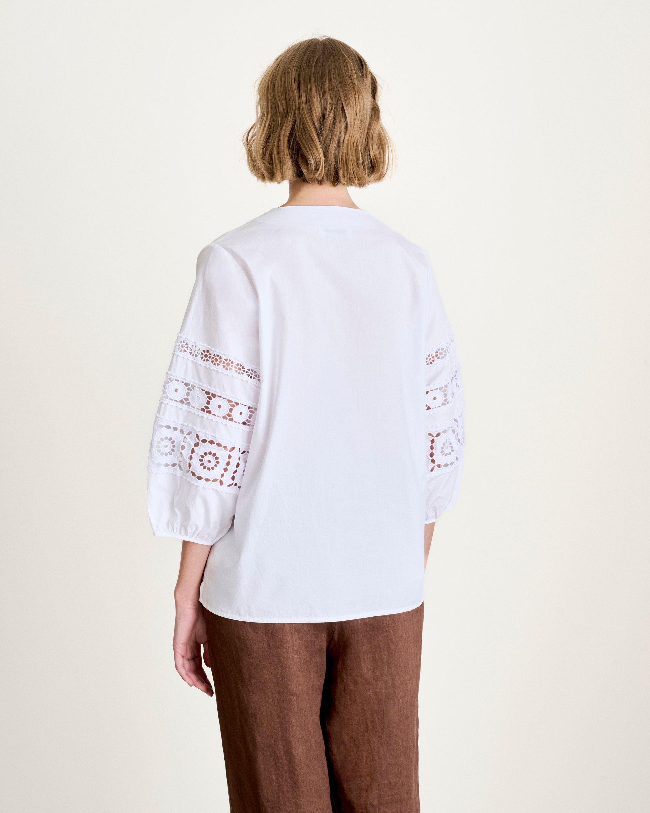 Blusa con inserti di passamaneria a ricamo in tinta. Realizzata in tessuto di cotone.