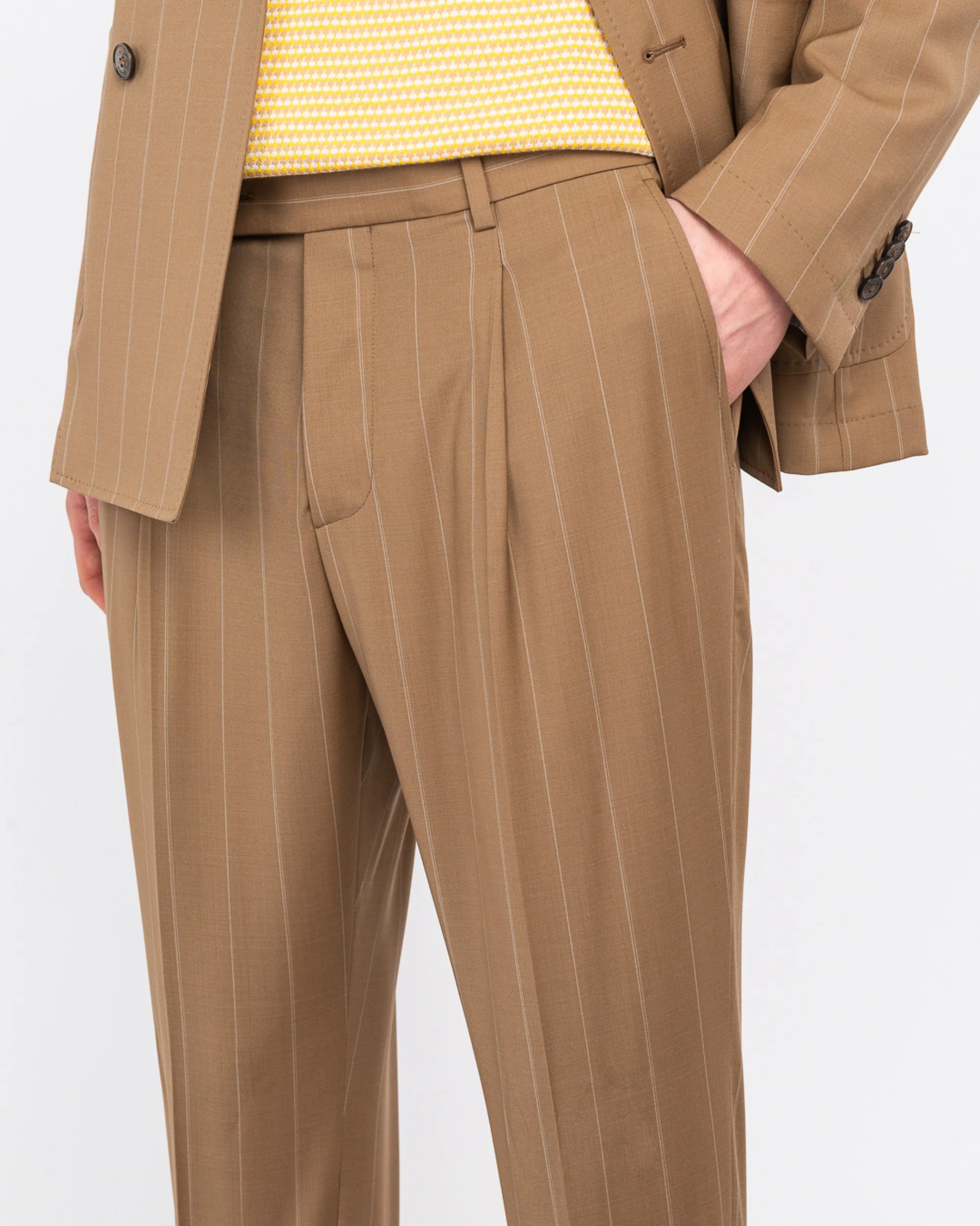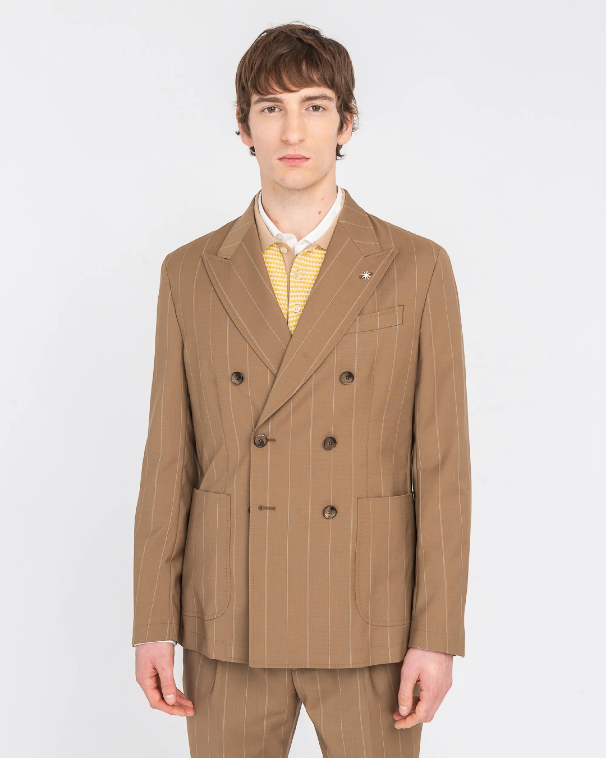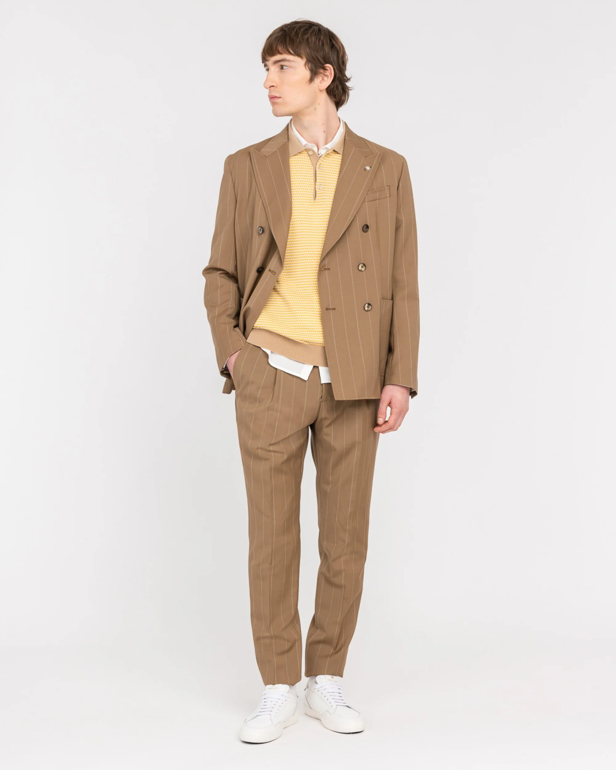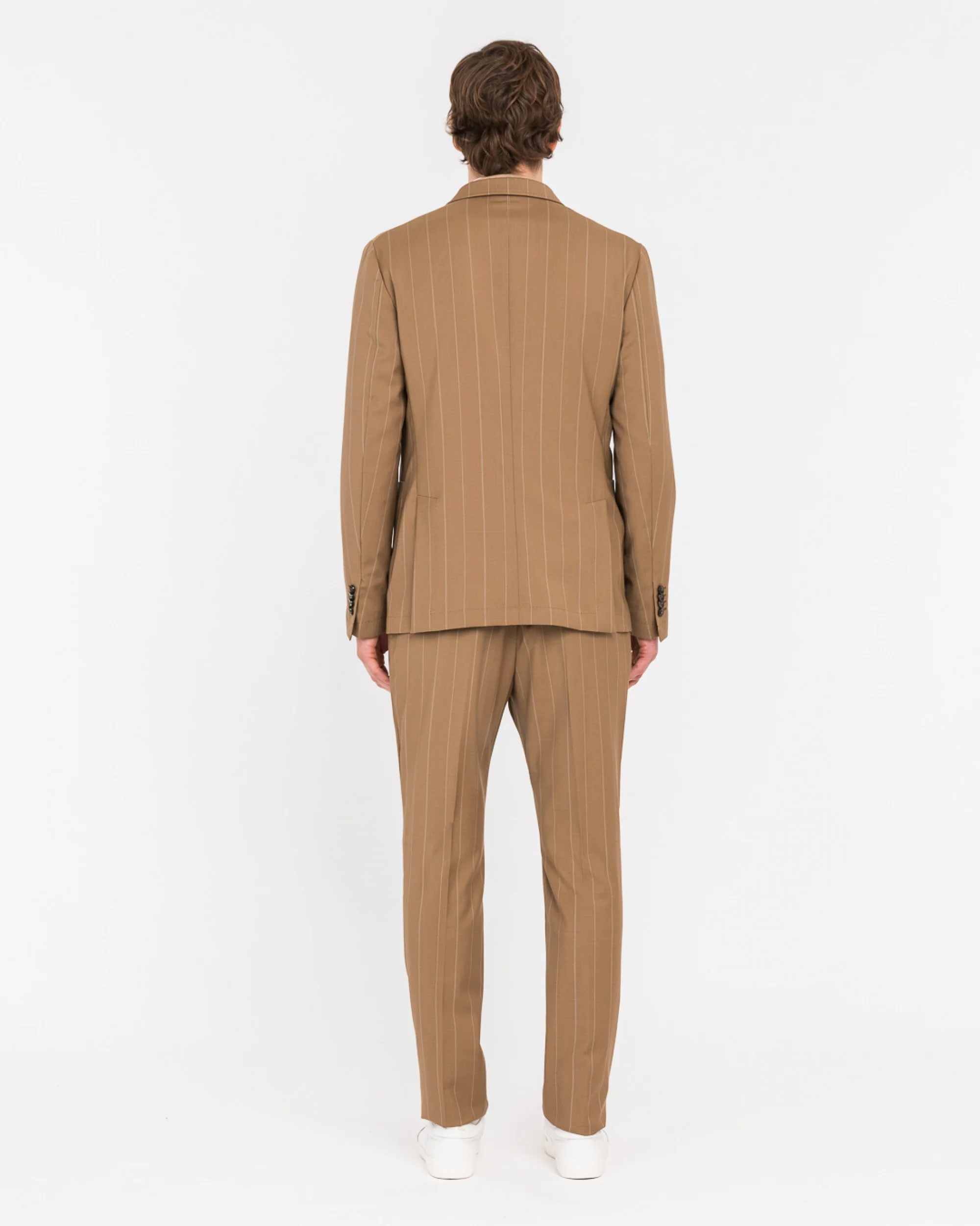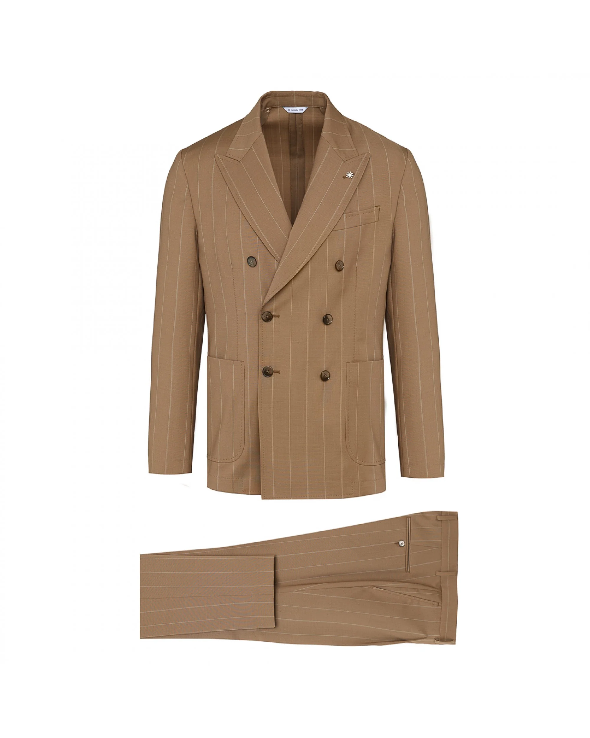 Descrizione: Abito doppiopetto NUVOLA drop otto completamente sfoderato. Giacca: ampio rever a lancia, due tasche a toppa e un taschino sul davanti, spacchi sul retro, quattro bottoni ai polsi, finiture con impuntura AMF, lunghezza 73 cm. Pantalone: slim fit, una pinces e due tasche america sul davanti, due a filo con bottoncino sul retro, chiusura con zip, gancio e bottone, fondo 17 cm. Gessato in pura lana natural stretch