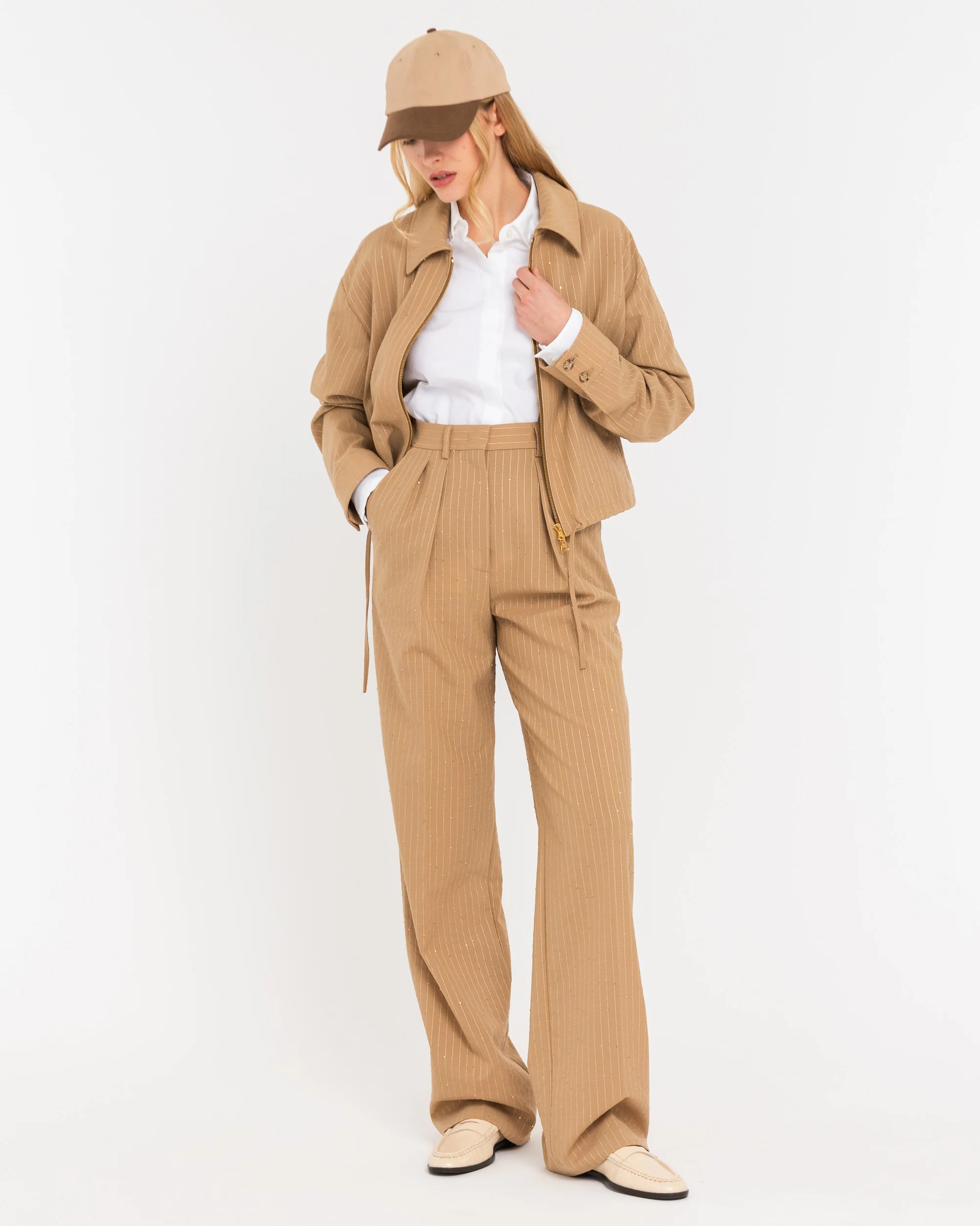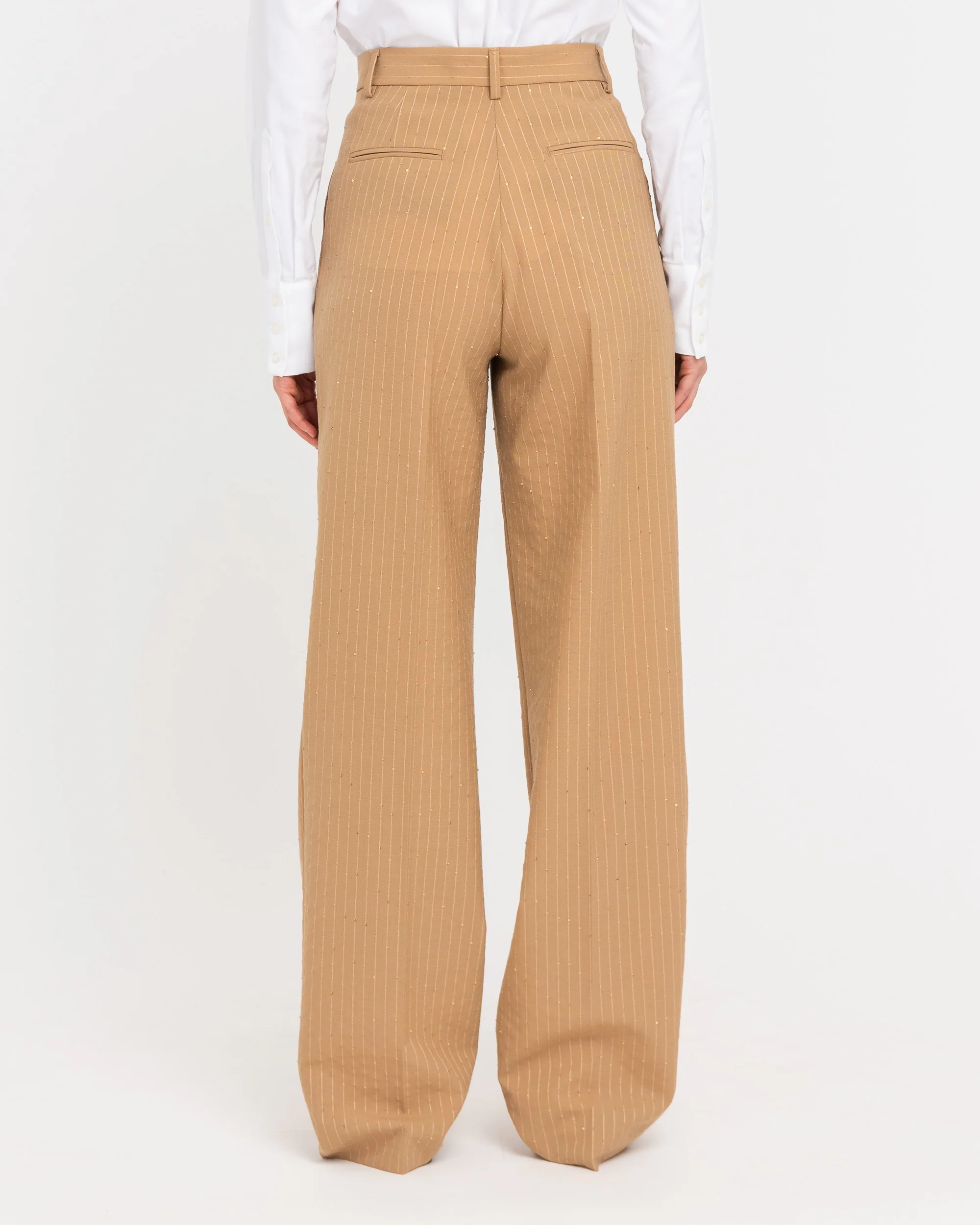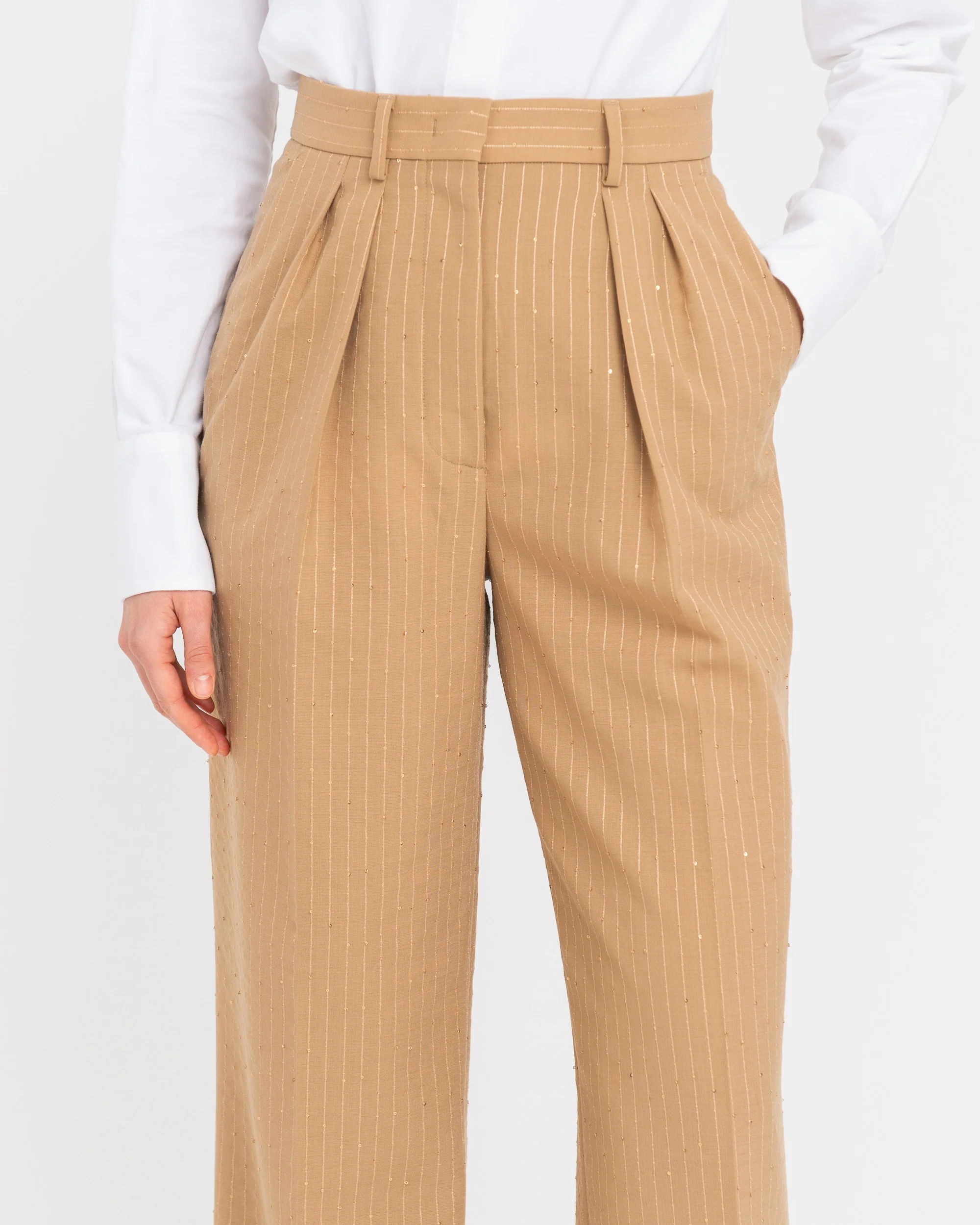 Descrizione: Pantalone a vita alta doppia pinces, due tasche america frontali e due a filo sul retro, chiusura con zip, gancio e bottone. Gessato micro paillettes misto lana stretch