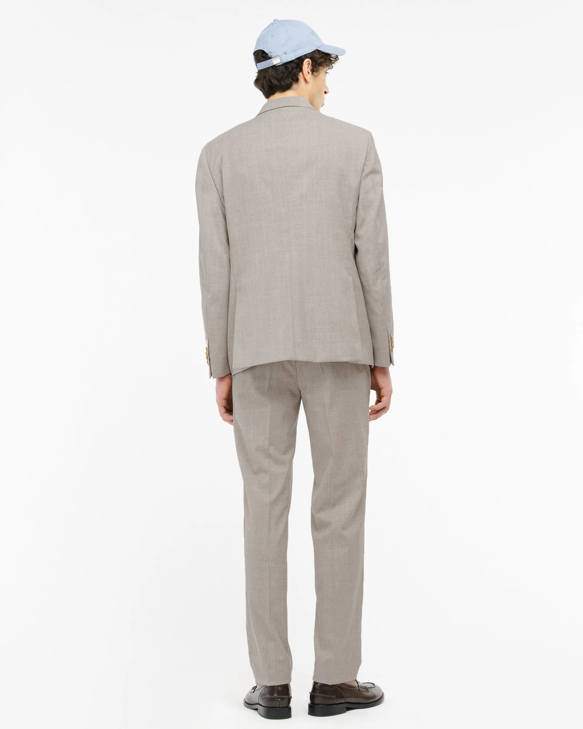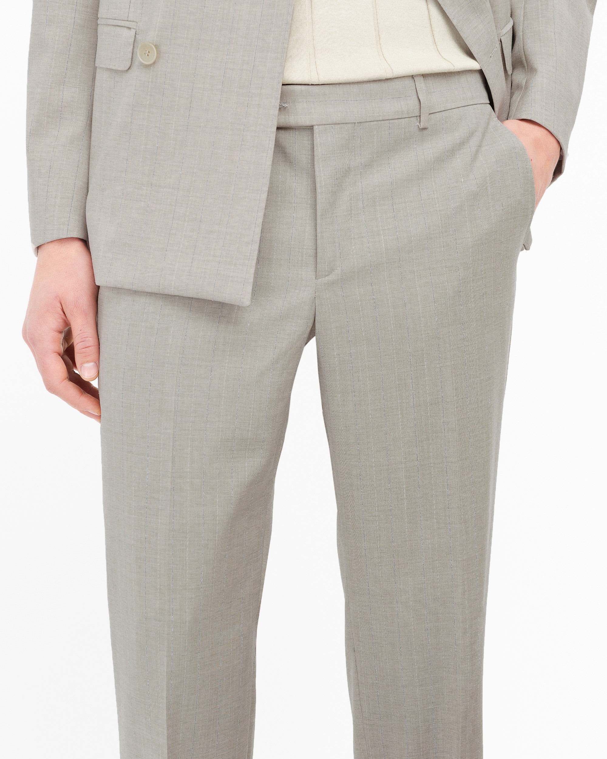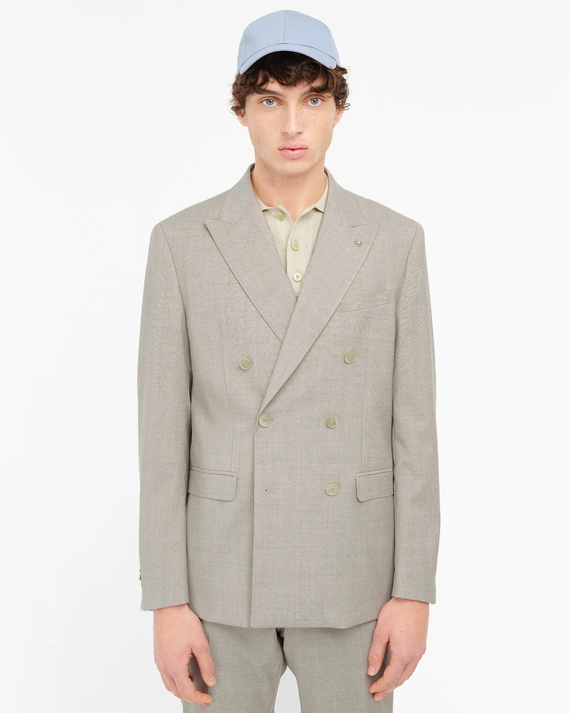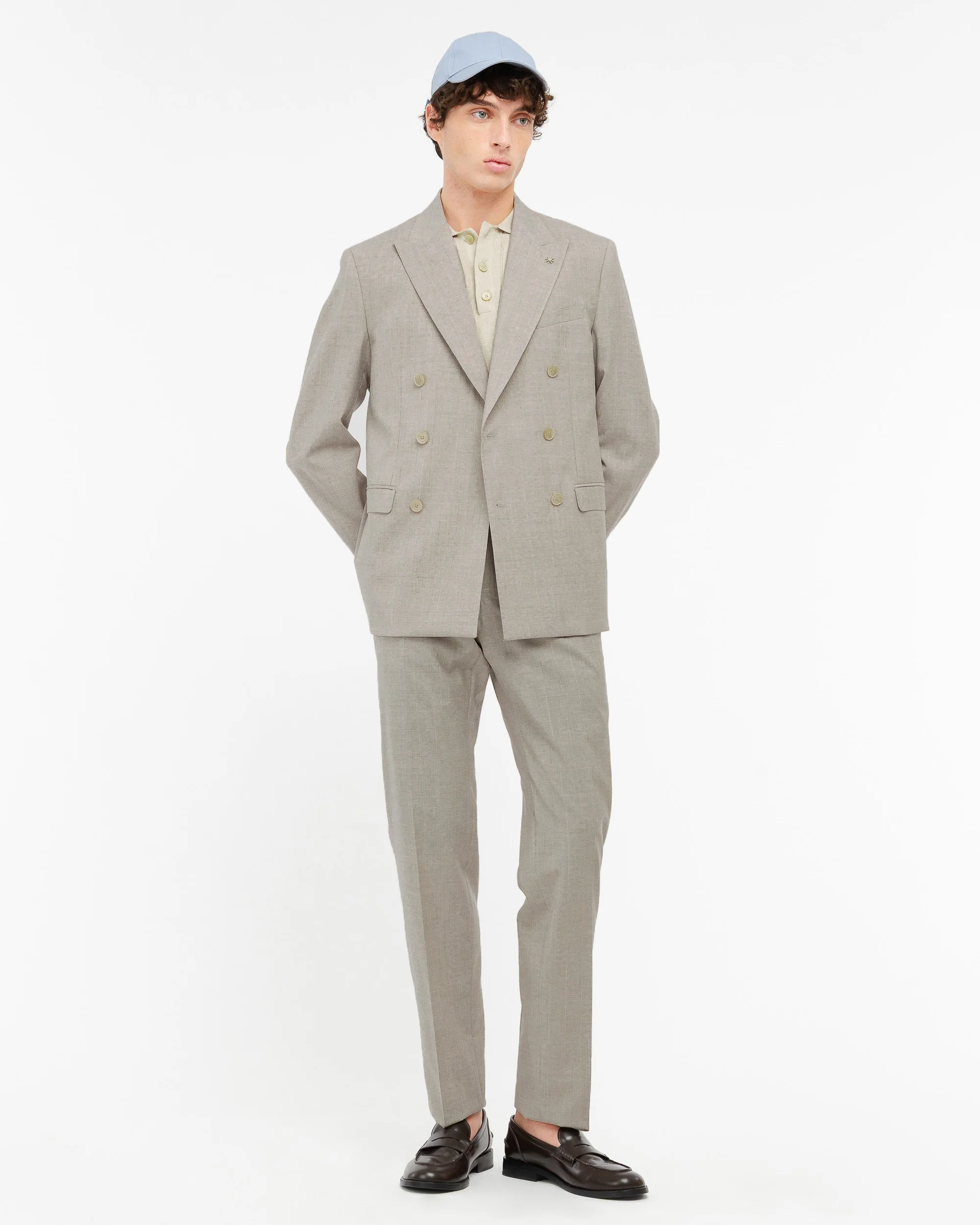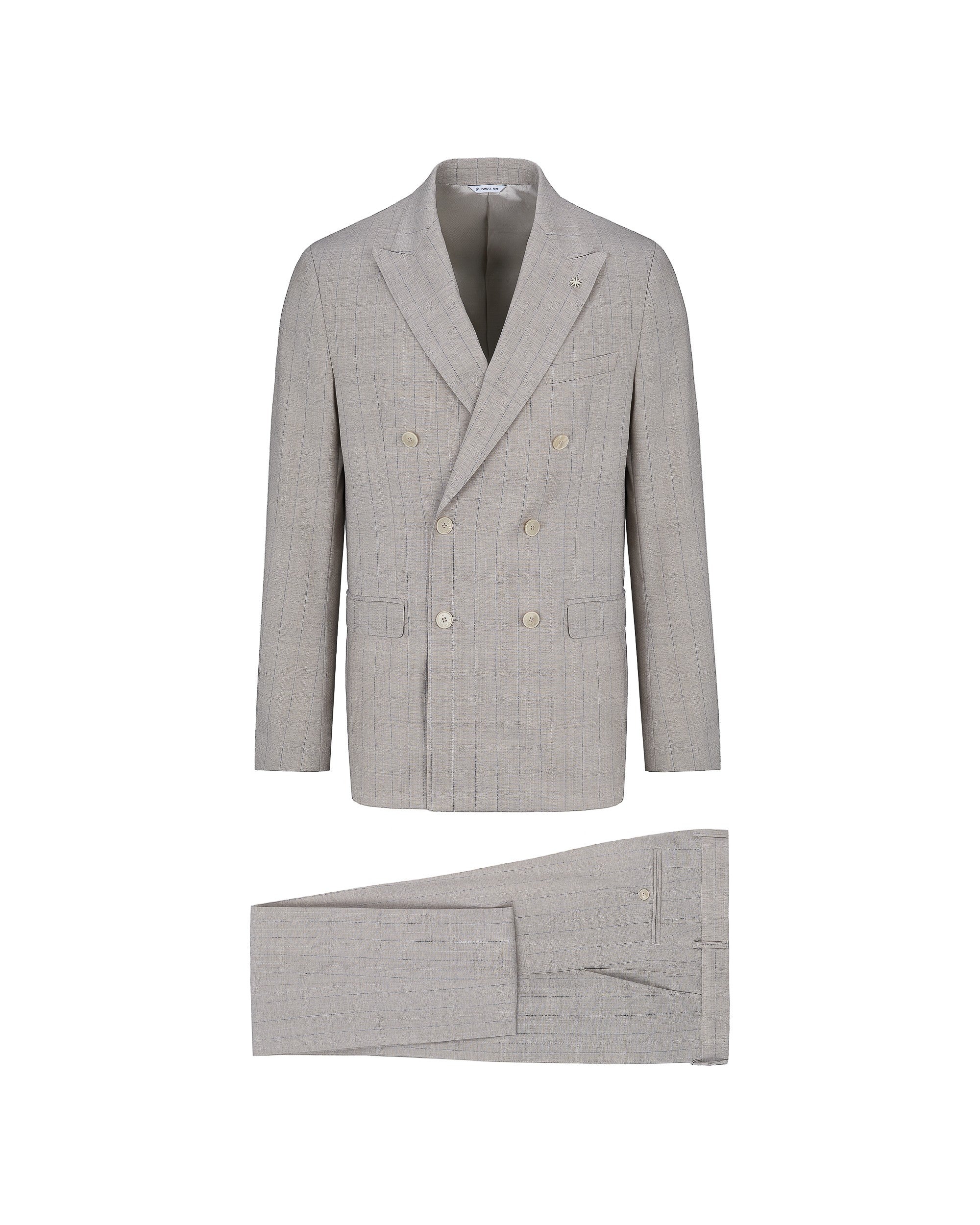 Abito doppiopetto drop 8 completamente foderato. Giacca: ampio rever a lancia, due tasche a pattina e un taschino sul davanti, due spacchi sul retro, quattro bottoni ai polsi. Pantalone: slim fit, due tasche america sul davanti, due a filo sul retro con bottoncino, passanti in vita, chiusura con zip, gancio e bottone, fondo 18 cm. Gessato in pura lana stretch