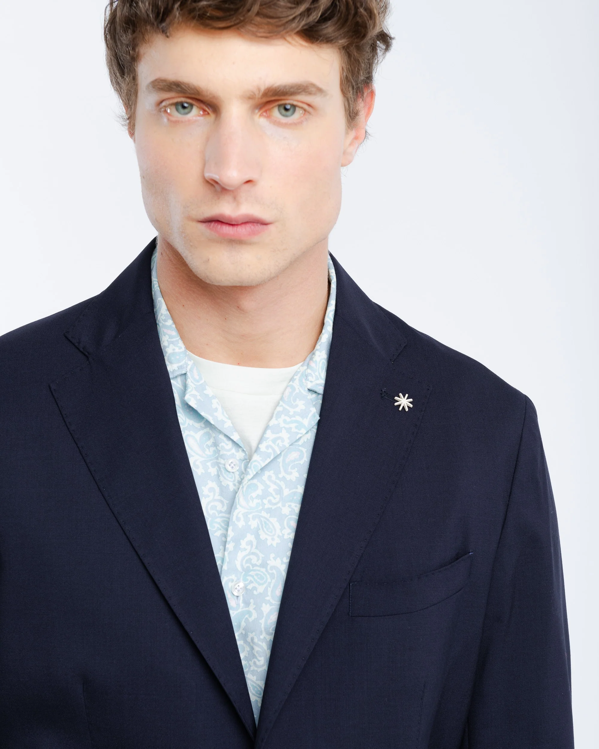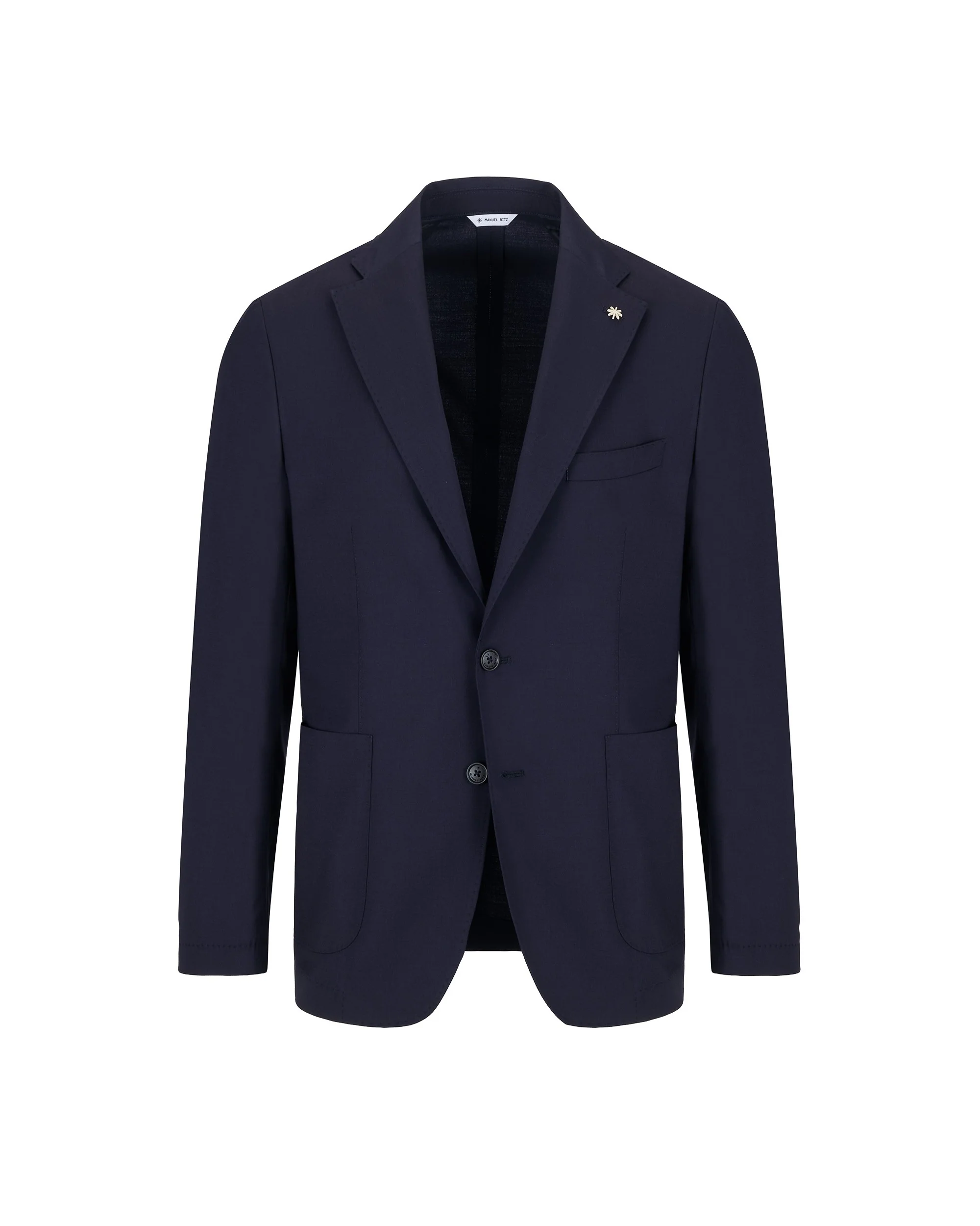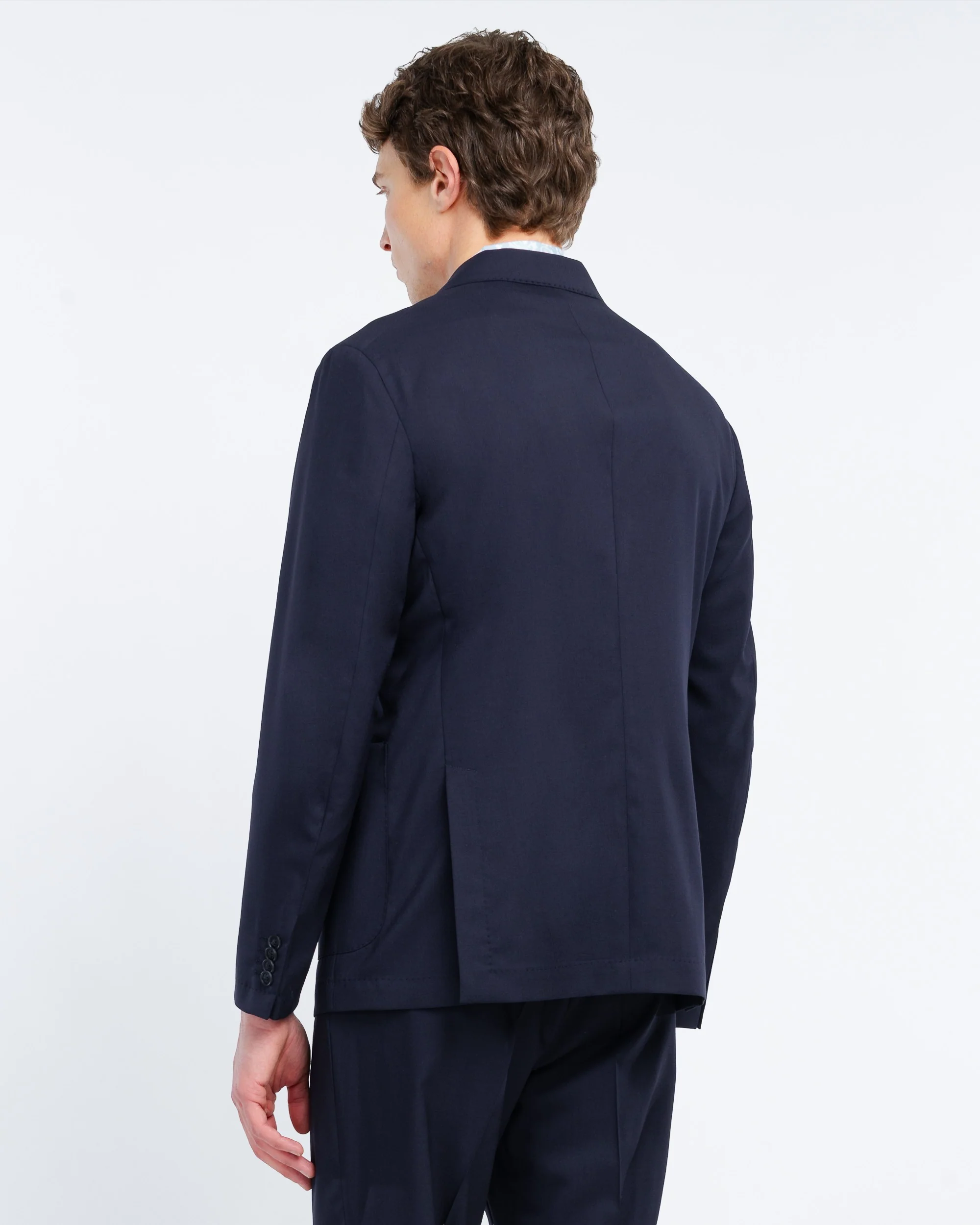 Giacca NUVOLA drop 8 sfoderata, chiusura due bottoni, due tasche a toppa e un taschino frontali, due spacchi sul retro, quattro bottoni ai polsi, finiture con impunture. Tela in pura lana stretch