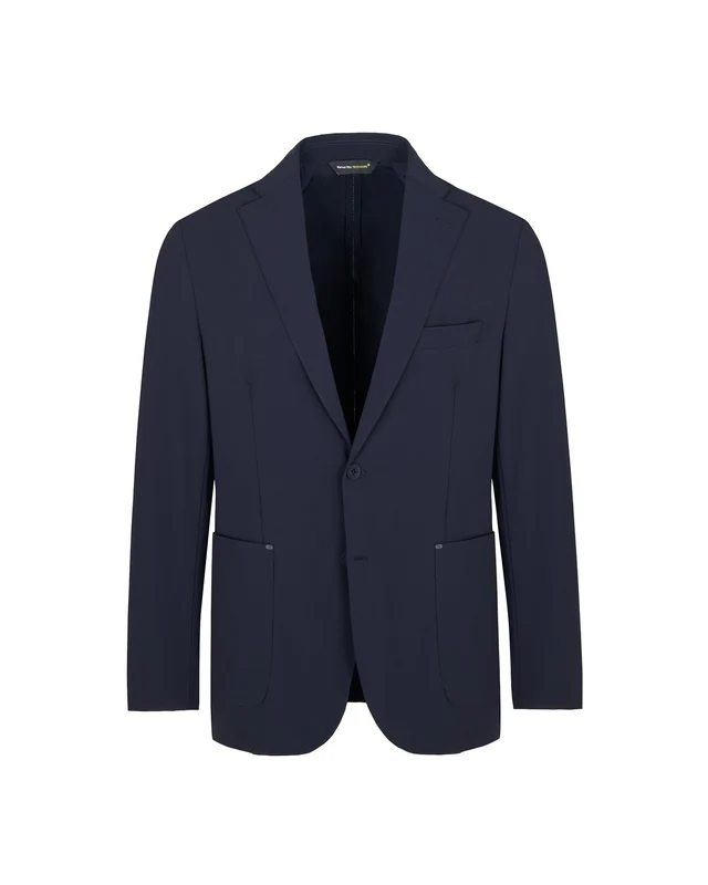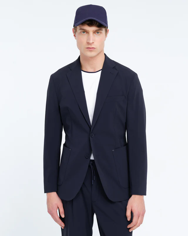 Descrizione: Giacca sfoderata tecnica, chiusura due bottoni, due tasche a toppa e un taschino frontali, due spacchi sul retro, quattro bottoni ai polsi, finiture con impunture. Tessuto tecnico elasticizzato