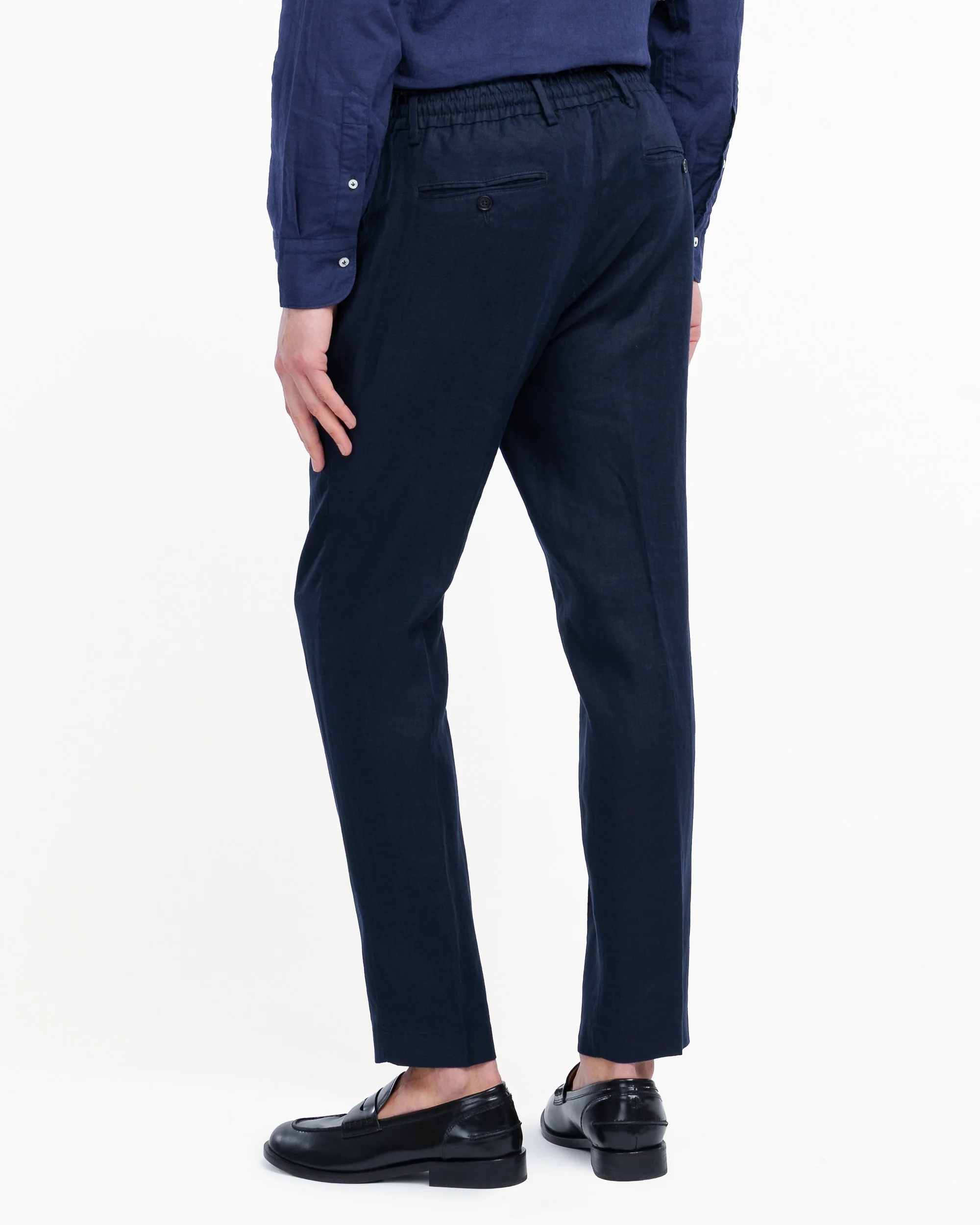 Pantalone jogging lavato, slim fit con una pinces, elastico e coulisse in vita, due tasche america frontali, due sul retro a filo con bottoncino, chiusura con zip, gancio e bottone, fondo 18 cm. Tela in puro lino