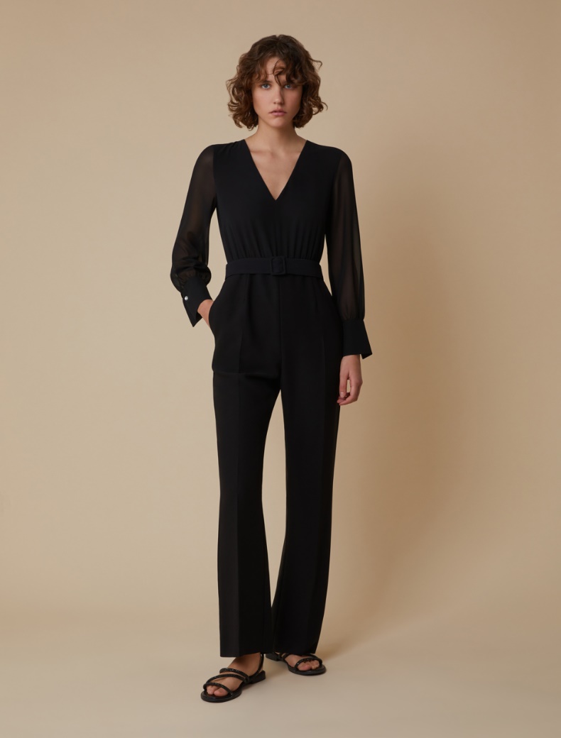 Top in georgette con scollo a V e maniche lunghe Pantaloni leggermente svasati in envers satin opaco Vita delineata con cintura abbinata Profonda apertura a goccia e zip invisibile sul retro Tasche inserite ai fianchi Bottoni bijou al collo e ai polsi