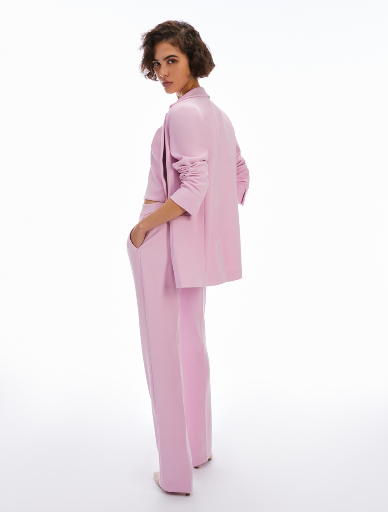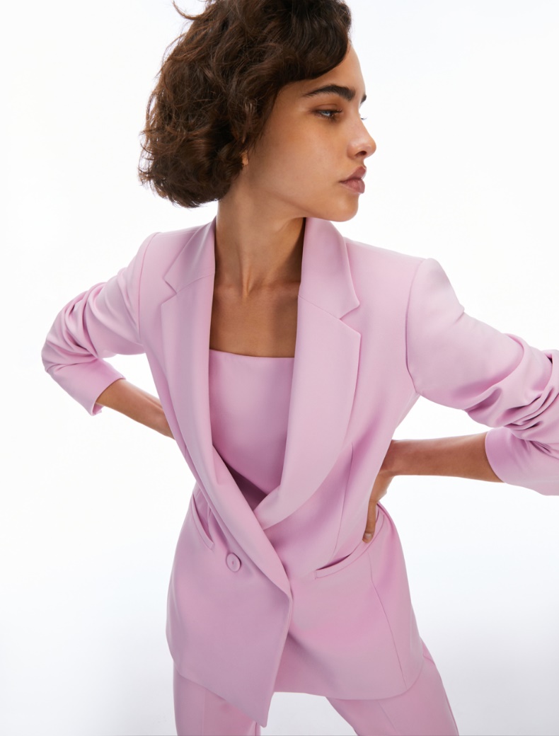Blazer doppiopetto in cady bi-stretch. Ha linee diritte e allungate, revers profondi e chiusura a due bottoni ricoperti in tessuto. Tasche a filo, spacchi ai polsi e sul retro. Foderato. Suit dallo stile impeccabile con i pantaloni coordinati.