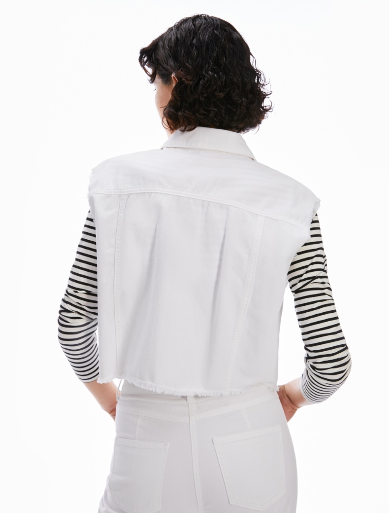 Descrizione: La classica giacca denim, reinventata in un’inedita versione a gilet. In bull di cotone, con ricami sangallo sul davanti, ha un taglio diritto con lunghezza cropped alla vita e orlo sfrangiato. Perfetta sui pantaloni coordinati, sui jeans e gli abiti estivi.
