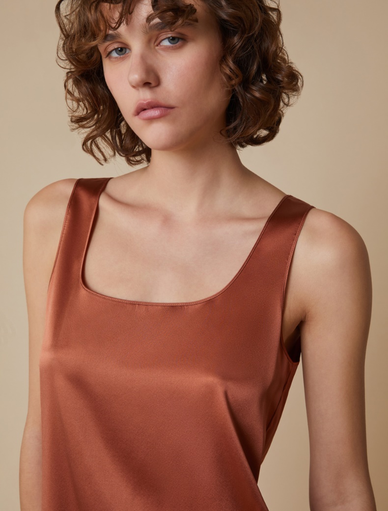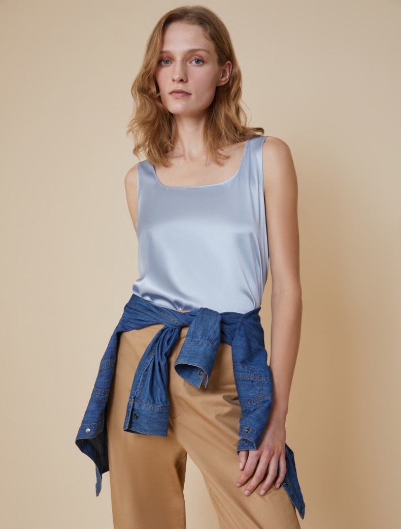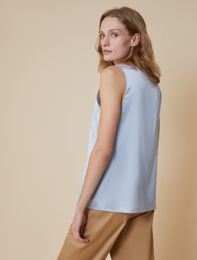 Descrizione: Con il tailleur in ufficio, i pantaloni eleganti per un’occasione speciale o i jeans nel weekend, il top in raso di seta darà un pizzico di charme in più a ogni look.