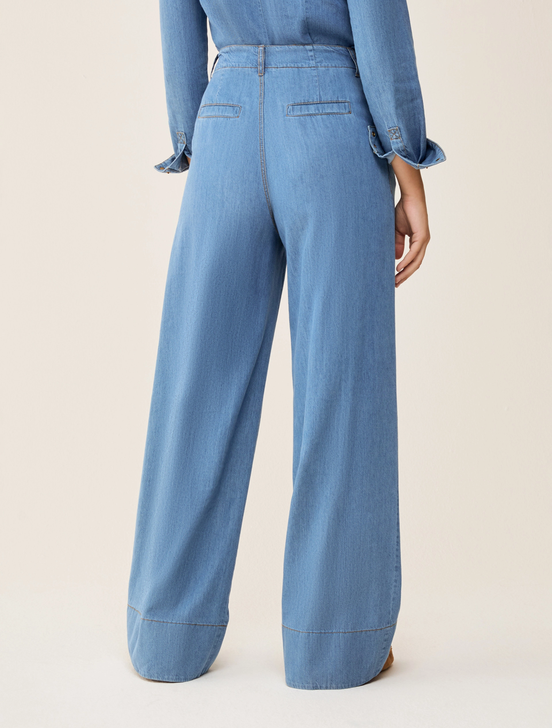 Tessuto principale contenente materie prime derivanti dalla cellulosa del legno, fibra ricavata nel rispetto del patrimonio forestale Denim leggero in lyocell e cotone Gamba diritta Vita regolare con passanti Tasche alla francese e pieghe sul davanti, a filo sul retro Chiusura con zip nascosta e bottone Impunture a contrasto Camicia coordinata in collezione