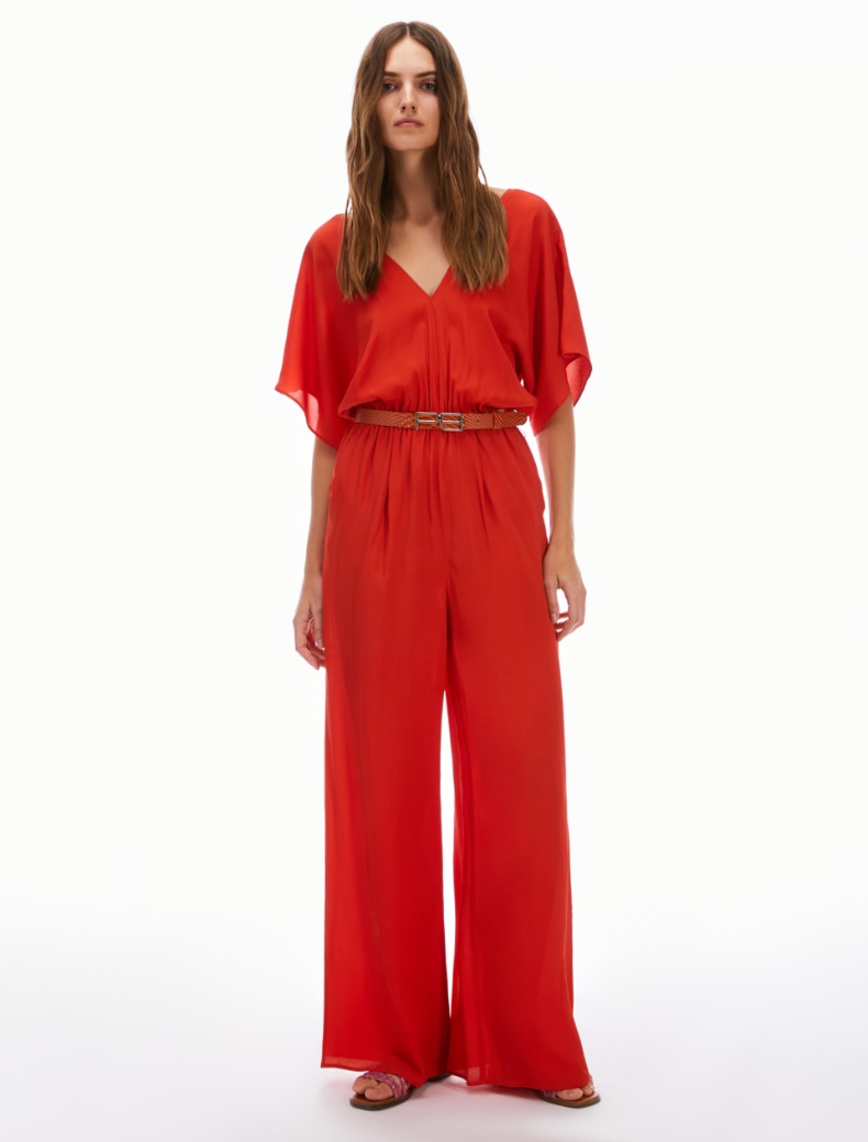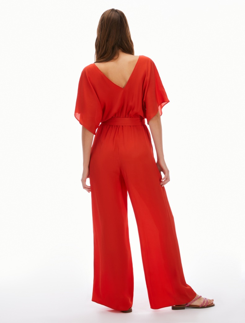 Descrizione: Tuta in blend di seta crêpe de Chine. Ha un taglio morbido con i pantaloni a palazzo e la vita delineata con la cintura da annodare. Scollo a V sul davanti e sulla schiena, maniche a kimono. Sfoderata.