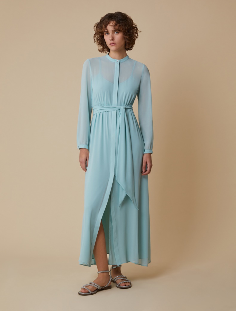 Georgette Linee che sfiorano il busto, gonna svasata Vita delineata con arricciatura e inserto elastico sul retro Collo a listino, maniche lunghe Abbottonatura nascosta sul davanti Capo completo di fusciacca coordinata e sottoveste