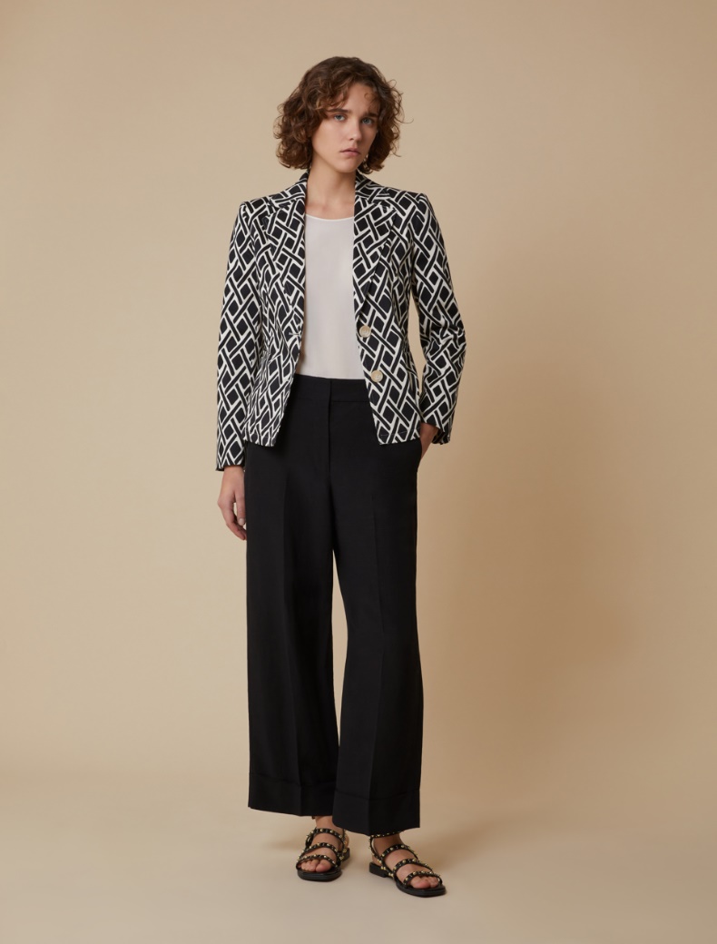 Tela di lino e viscosa con texture fiammata Linee ampie e diritte, vita regolare con passanti Tasche alla francese sul davanti, a filo sul retro Piega stirata Risvolto al fondo Chiusura nascosta con gancio e zip Blazer coordinato in collezione