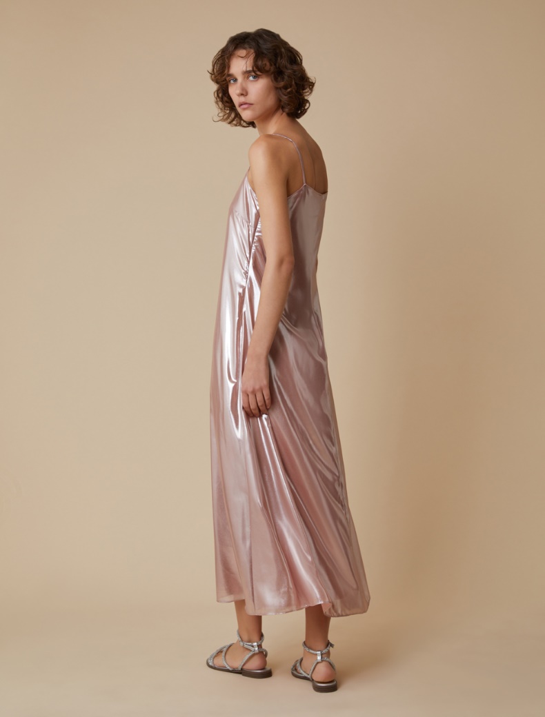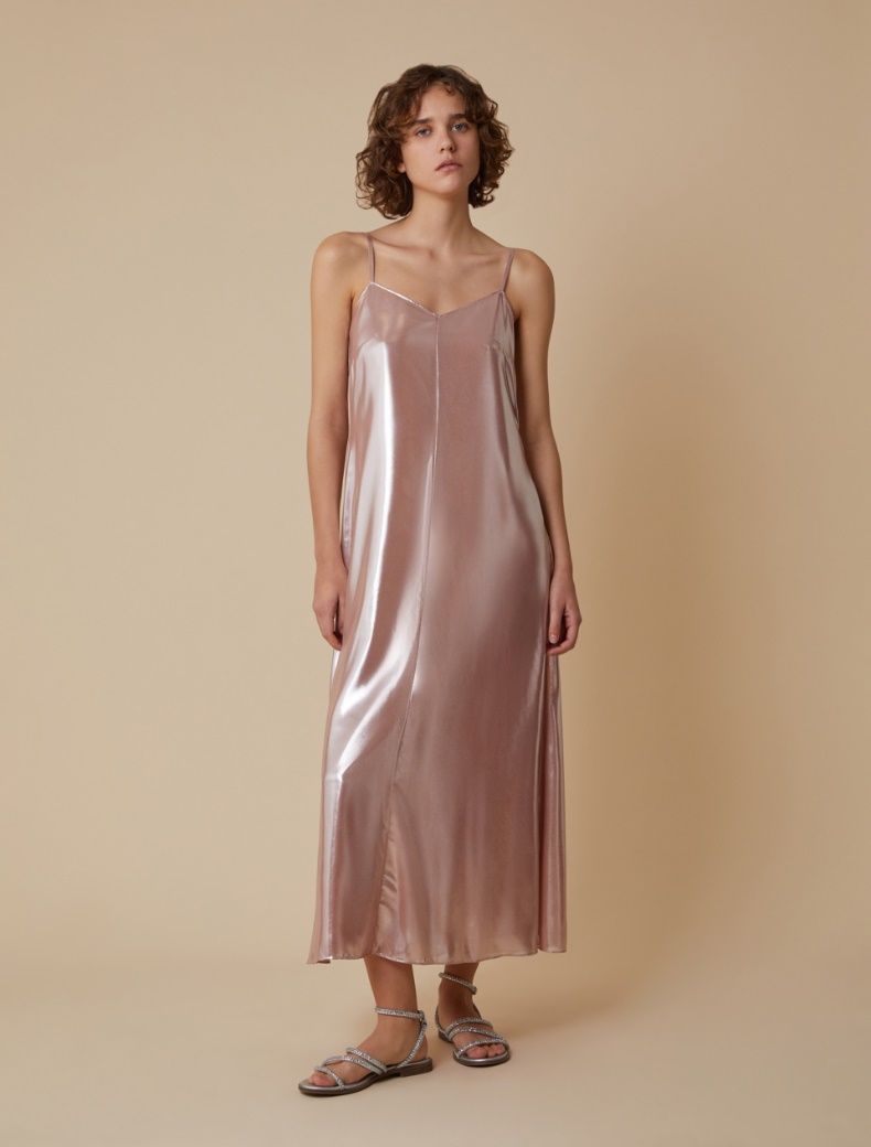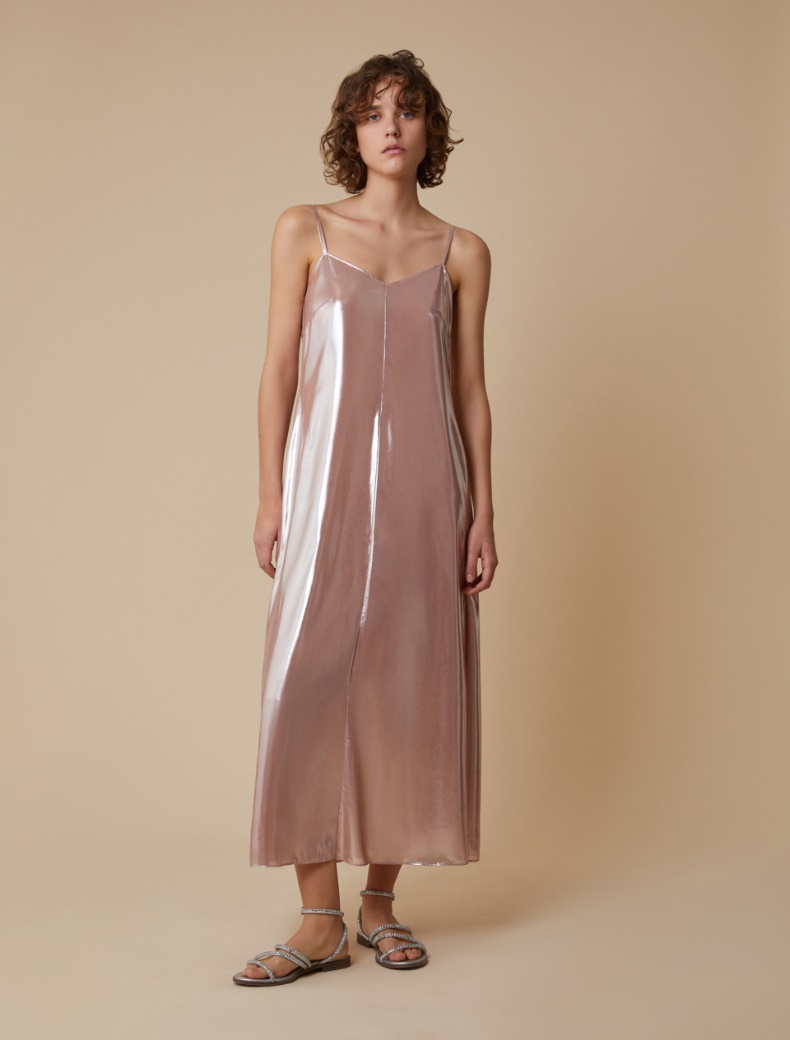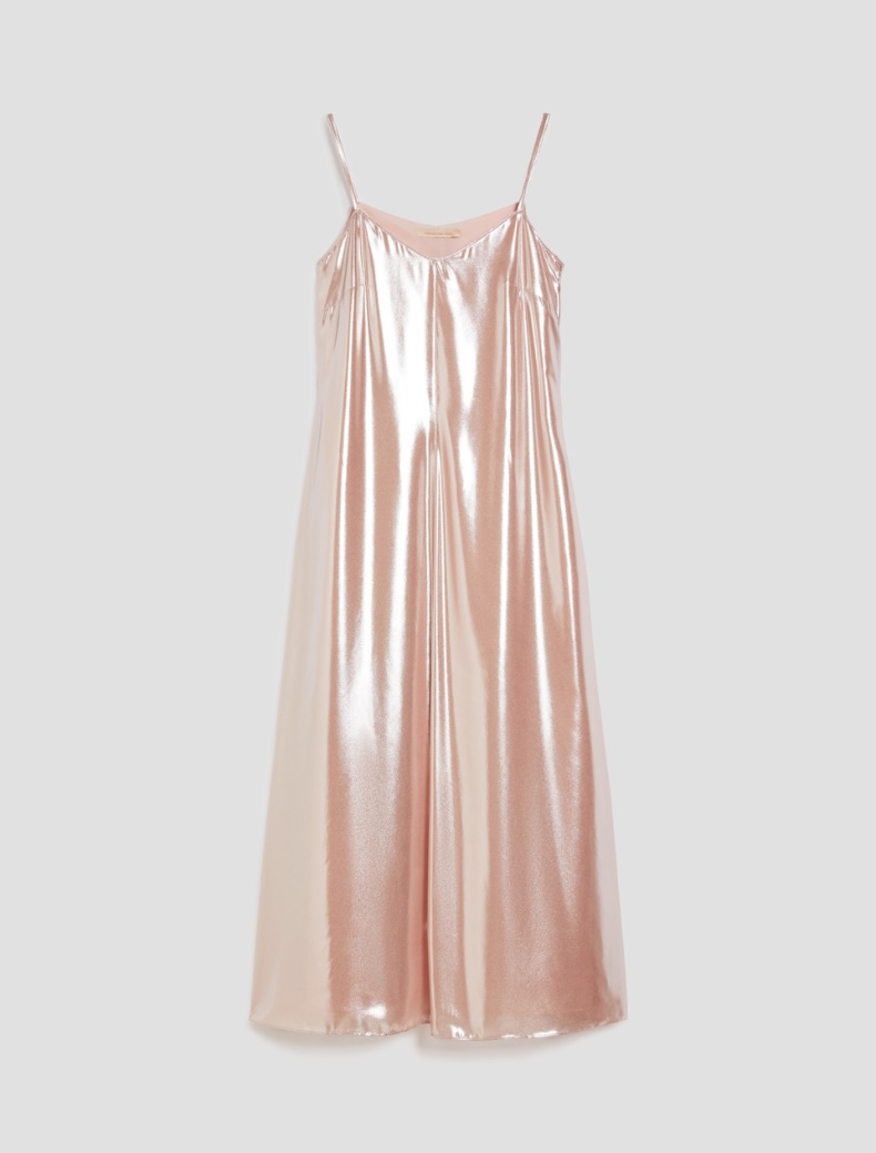 Descrizione: Georgette con finish laminato Linee che sfiorano il busto, svasate al fondo Spalline sottili Scollo a V sul davanti, diritto sul retro Zip invisibile al fianco Capo foderato