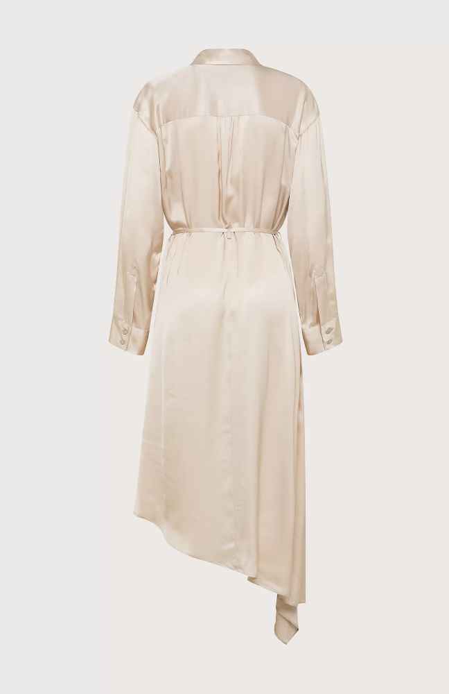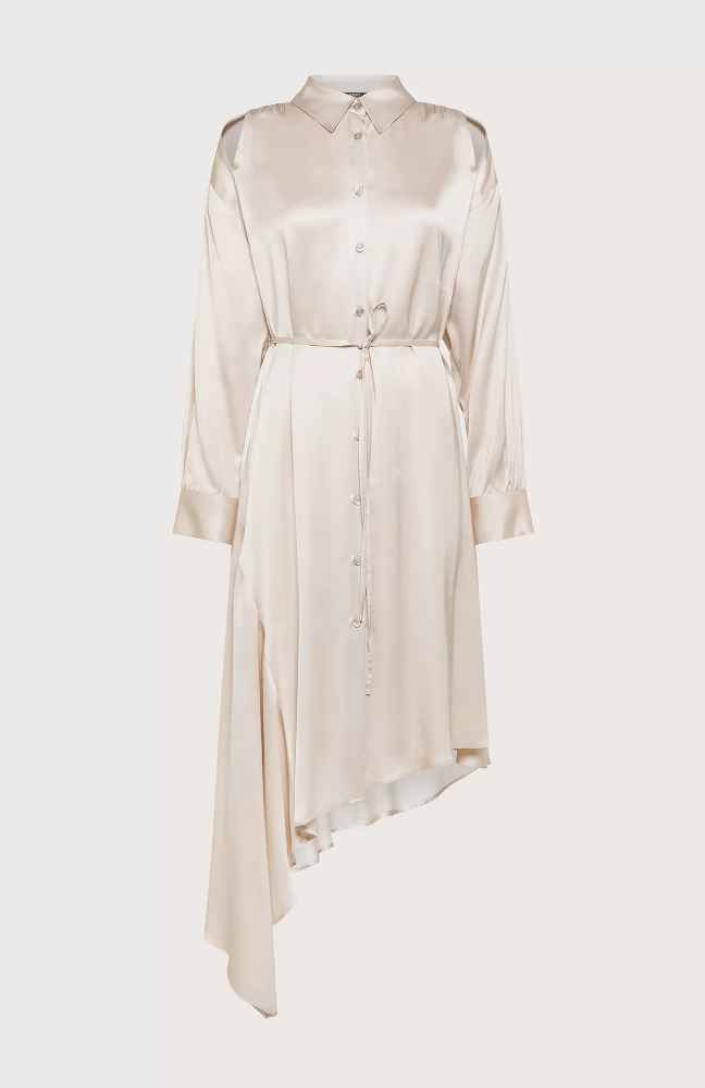 Descrizione: Vestito chemisier realizzato in viscosa satin con spacchetti sulle spalle. Colletto e abbottonatura davanti, manica lunga con polsino e bottone, fondo asimmetrico e laccetto in vita.