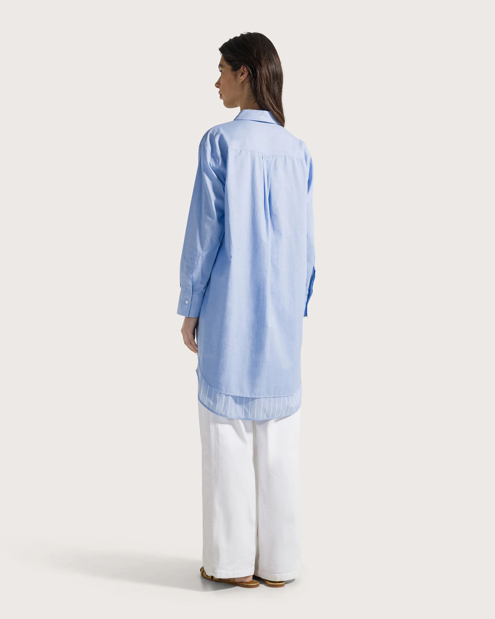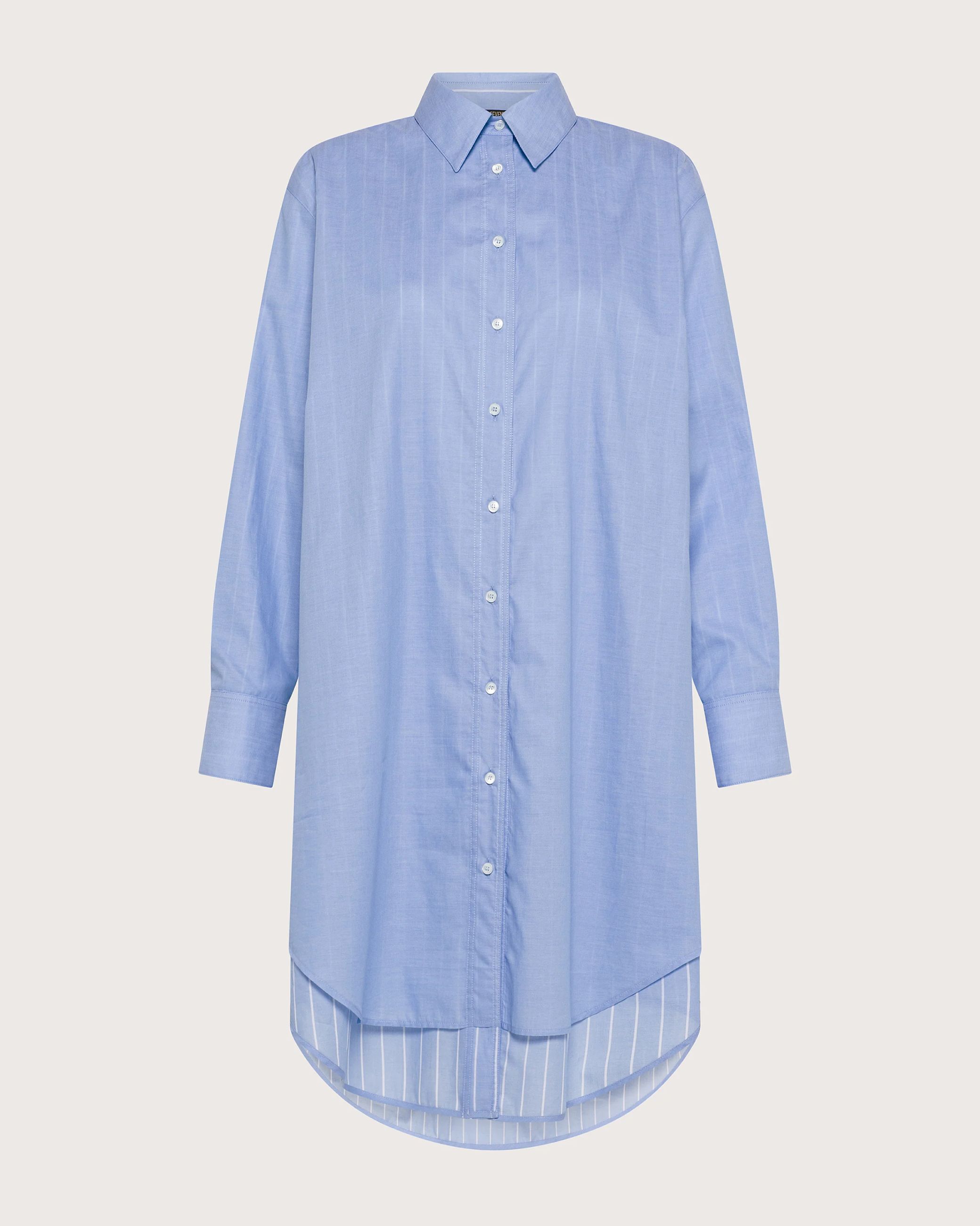 Abito chemisier doppiato in voile di cotone azzurro su un lato e in cotone tinto filo sul lato della vestibilità interna. Questo abito ha quindi la doppia vestibilità tinta unita oppure tinto filo.