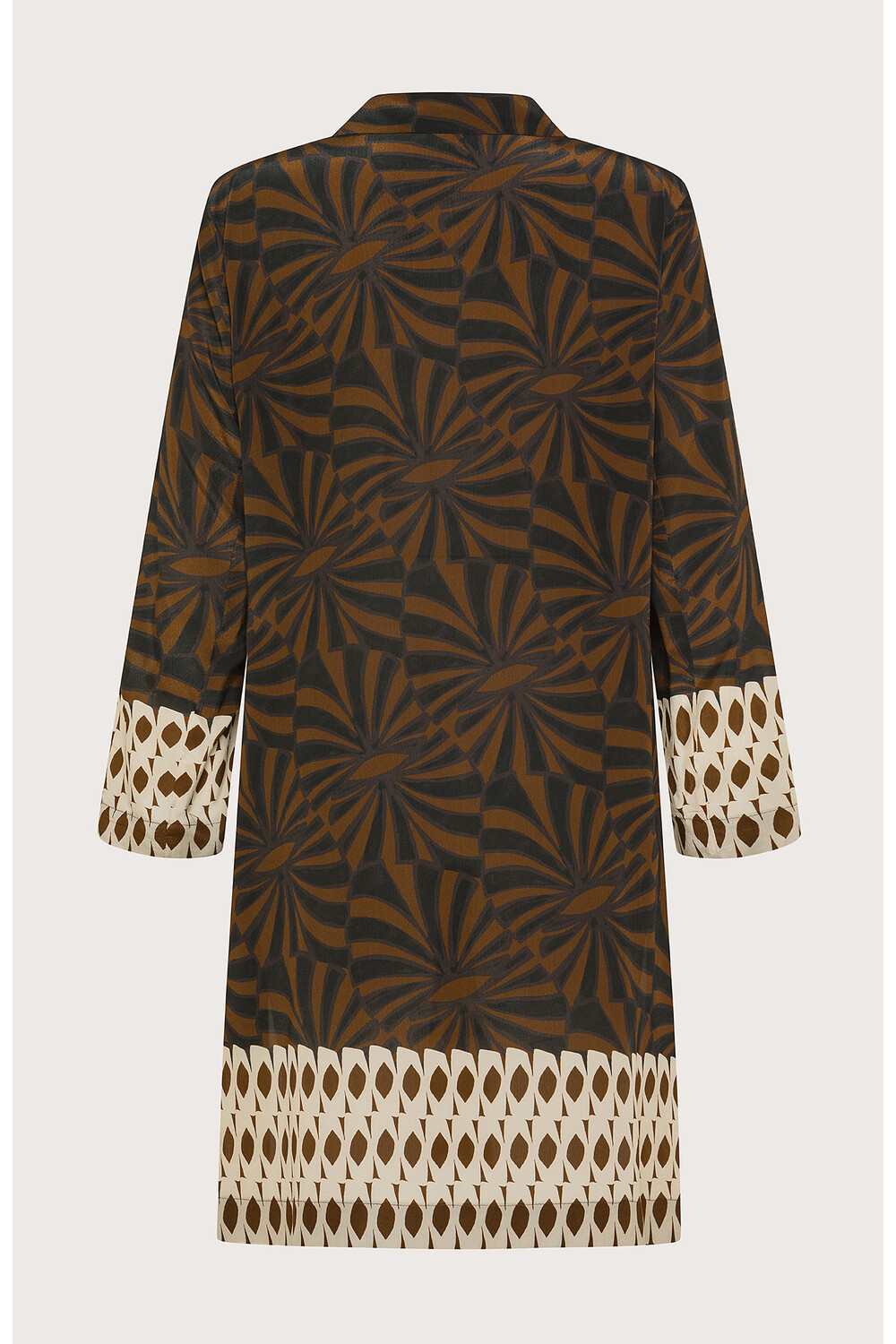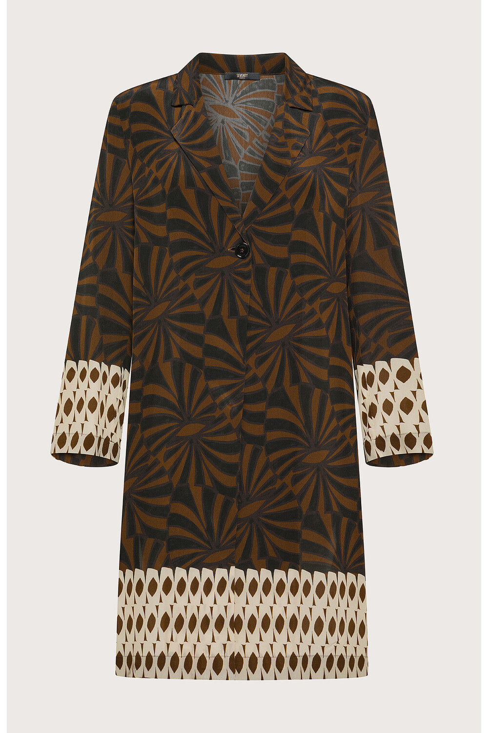 Descrizione: Cappotto soprabito midi realizzato in crêpe viscosa con stampa etnica foliage. Colletto a revers e chiusura con un unico bottone frontale. Dettaglio bordi con contrasto.
