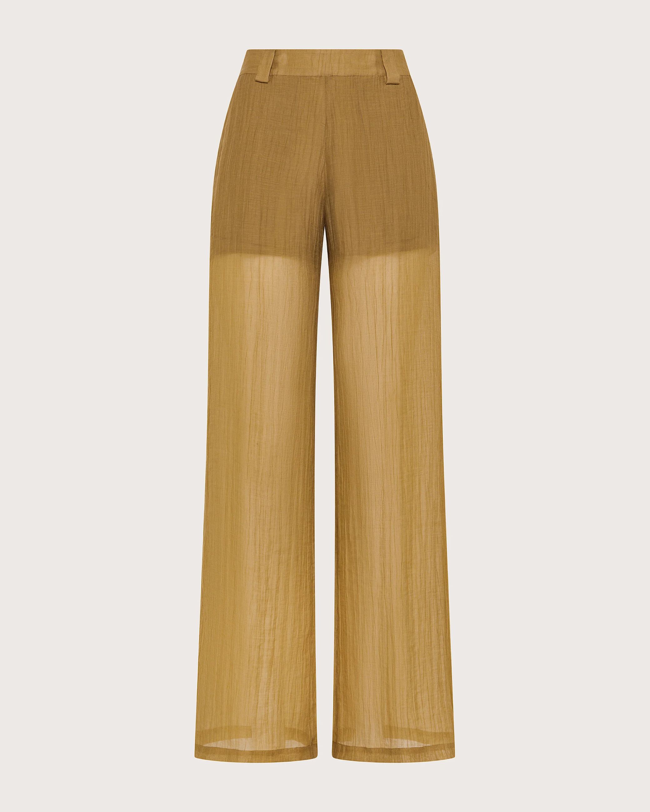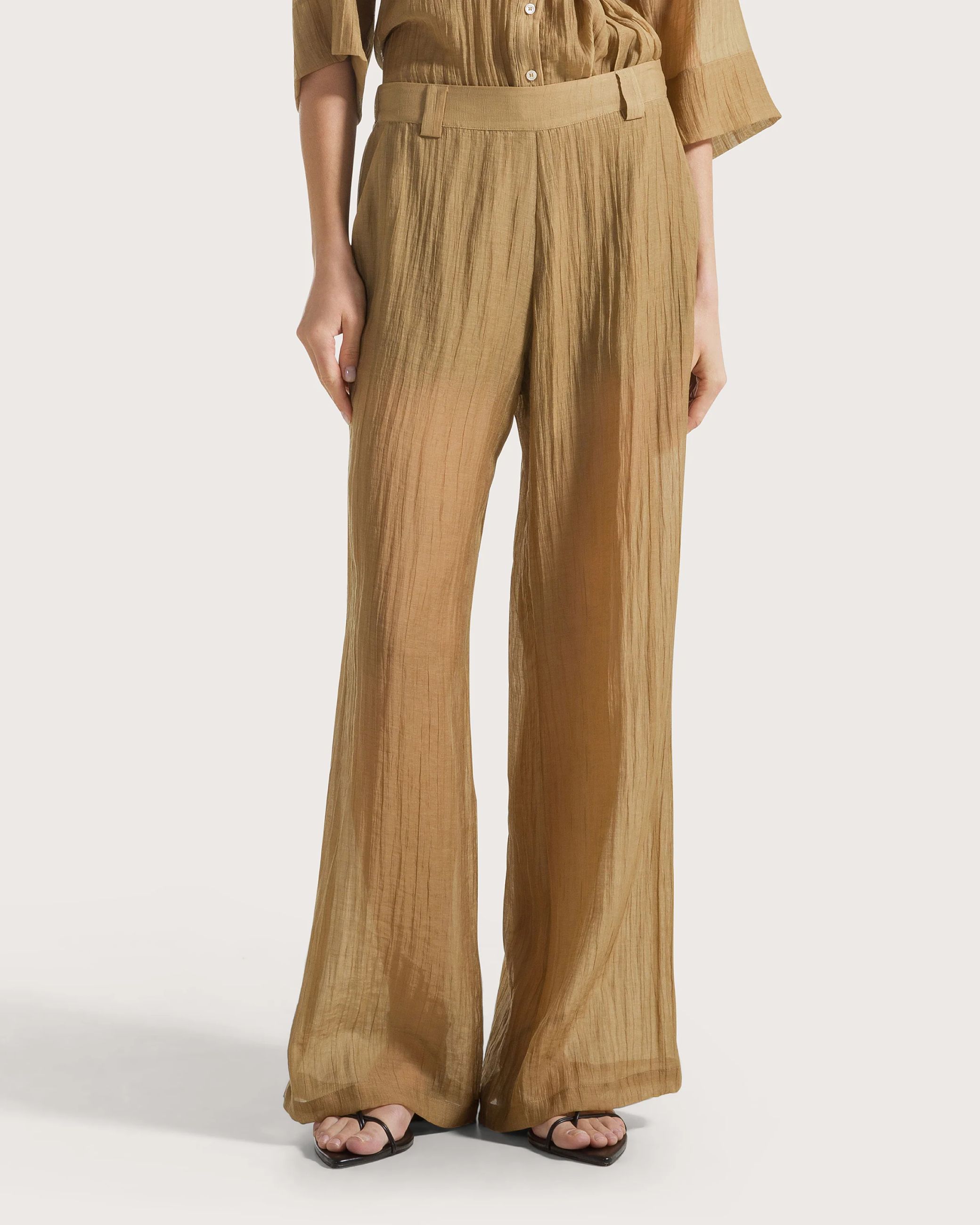 Pantalone ampio in voile unito fiammato stropicciato con elastico sul retro e cintura piatta frontale con tasche laterali .
