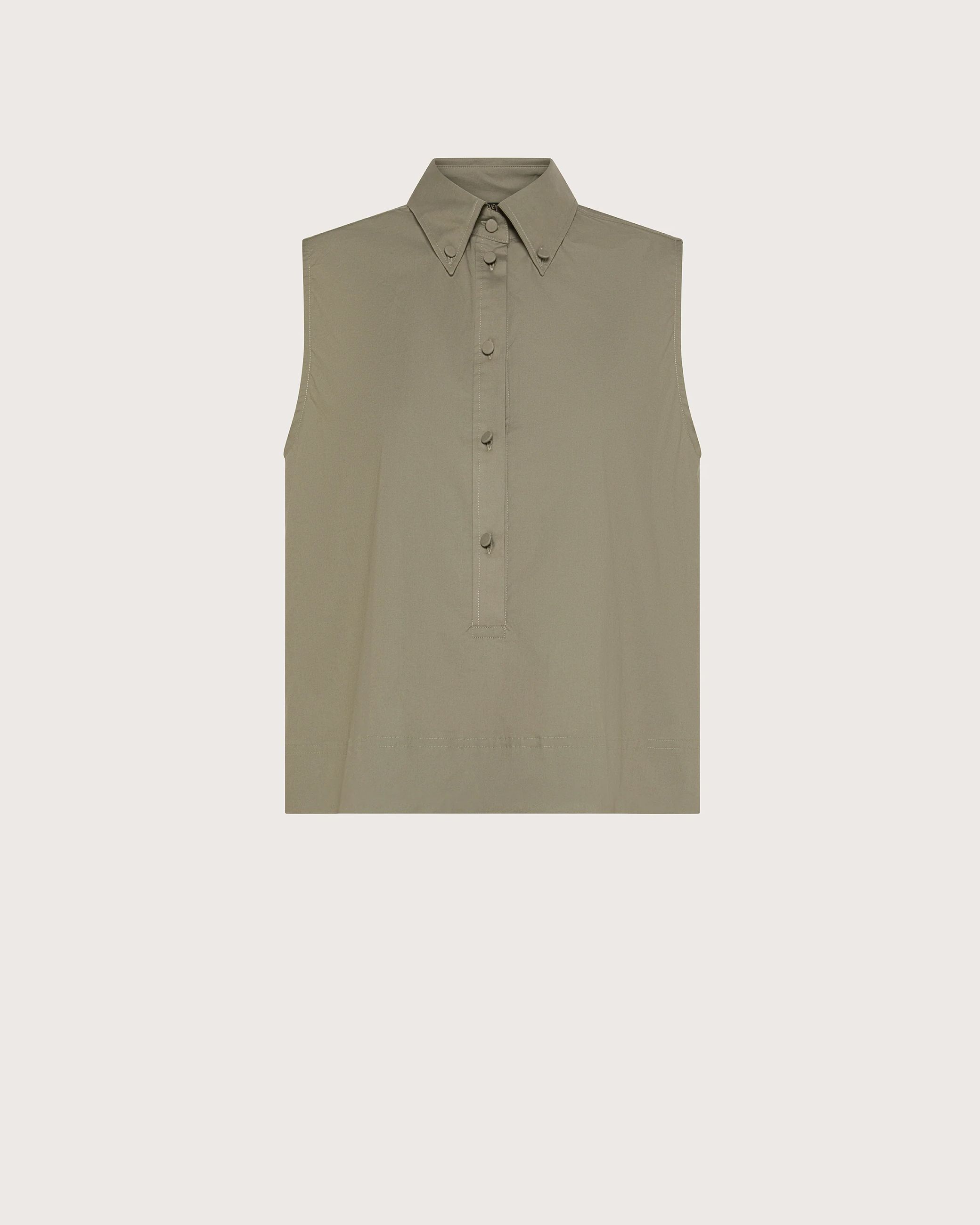 Camicia smanicata in popeline stretch con collo button down e scollo a polo con bottoni rivestiti.