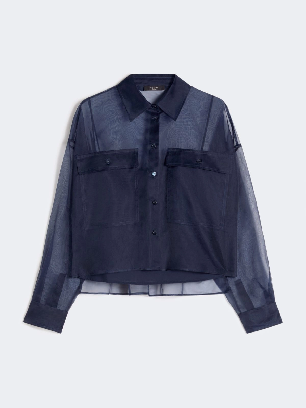 Vestibilità boxy Camicia in organza di pura seta Colletto e polsini a camicia Maniche lunghe a giro basso Chiusura frontale con bottoni a vista Tasche a toppa con patta e bottone sul petto Spacchi laterali Fondo asimmetrico più lungo sul retro