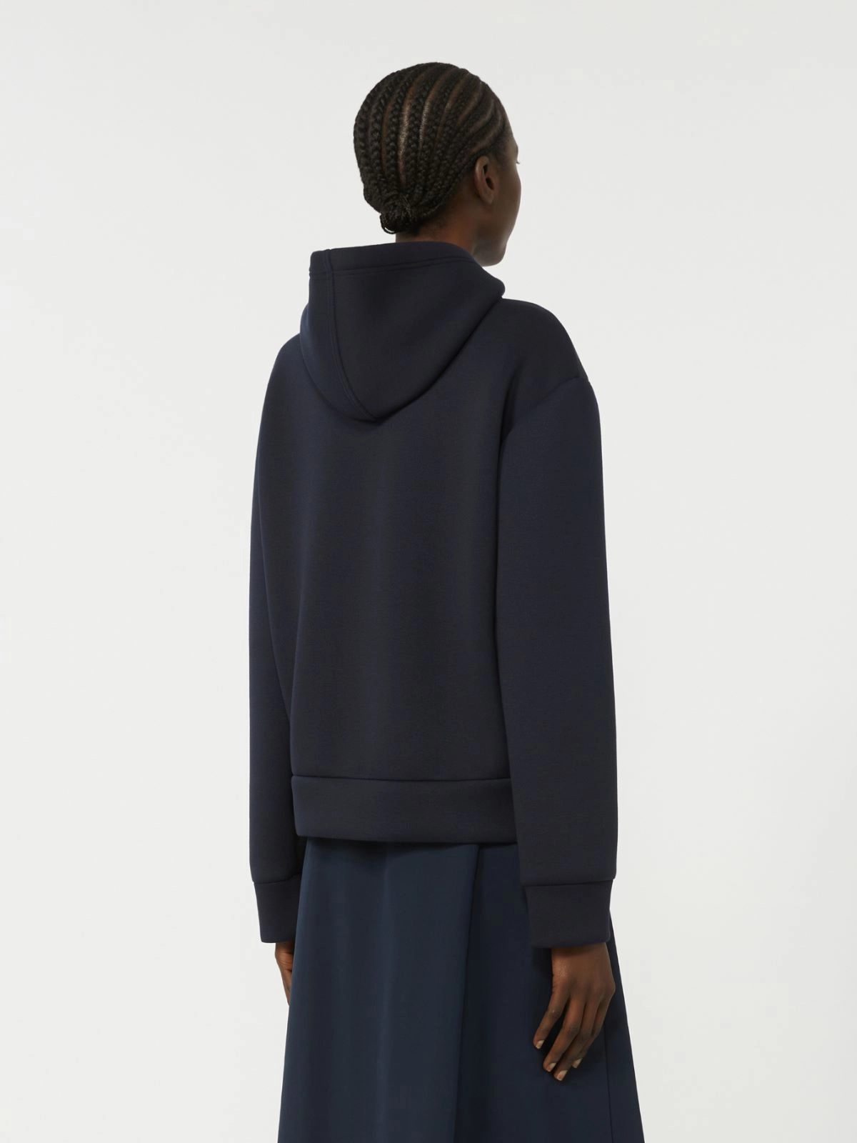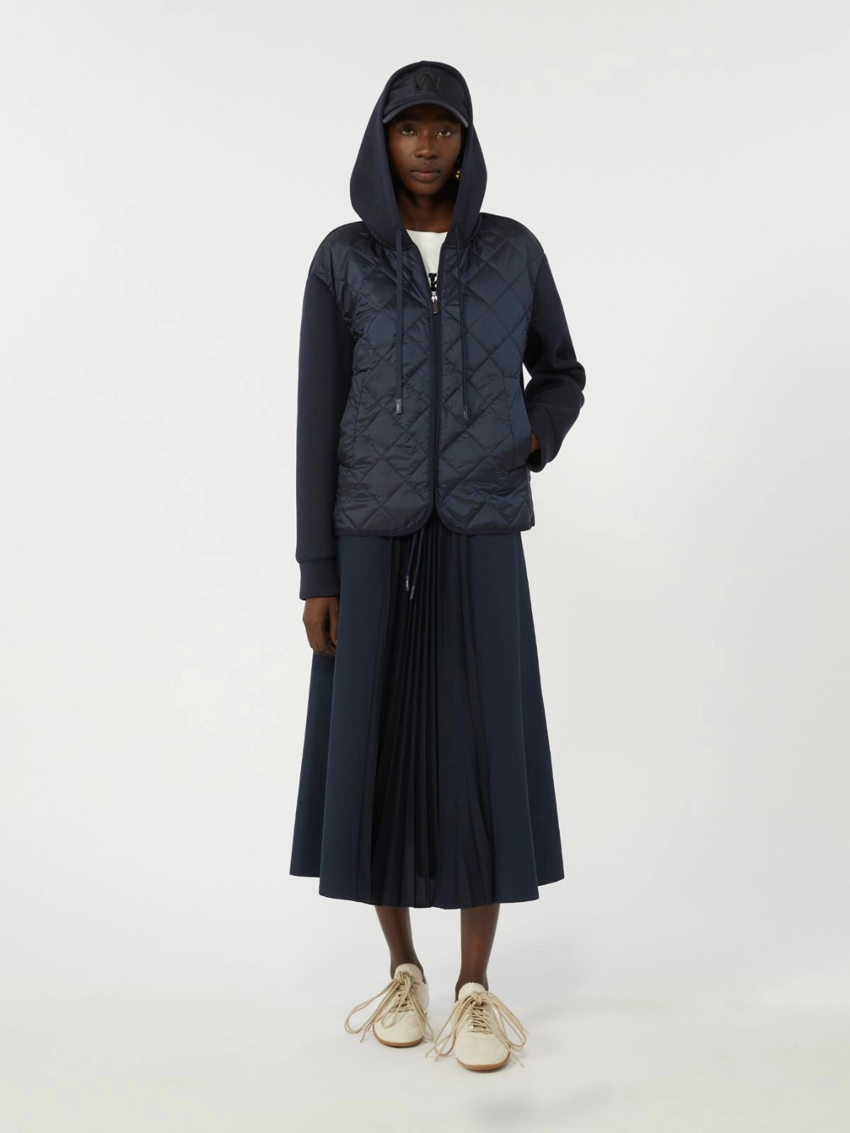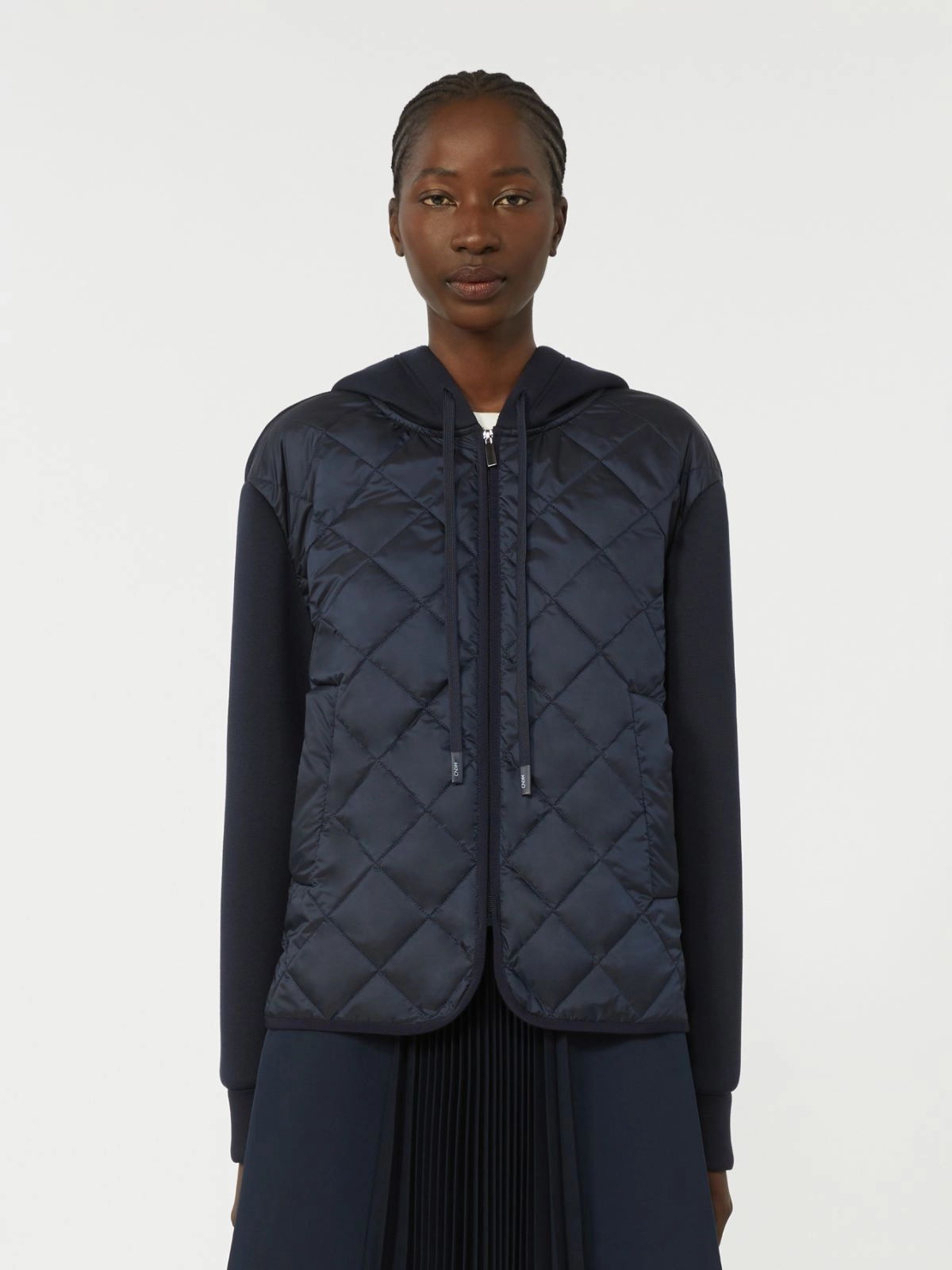 Giacca in jersey scuba piquette Inserto frontale in tela antigoccia con trapuntatura a rombi Maniche lunghe con spalla scesa Chiusura con zip invisibile Tasche a filetto sui fianchi Fondo stondato bordato sul davanti con spacchi laterali