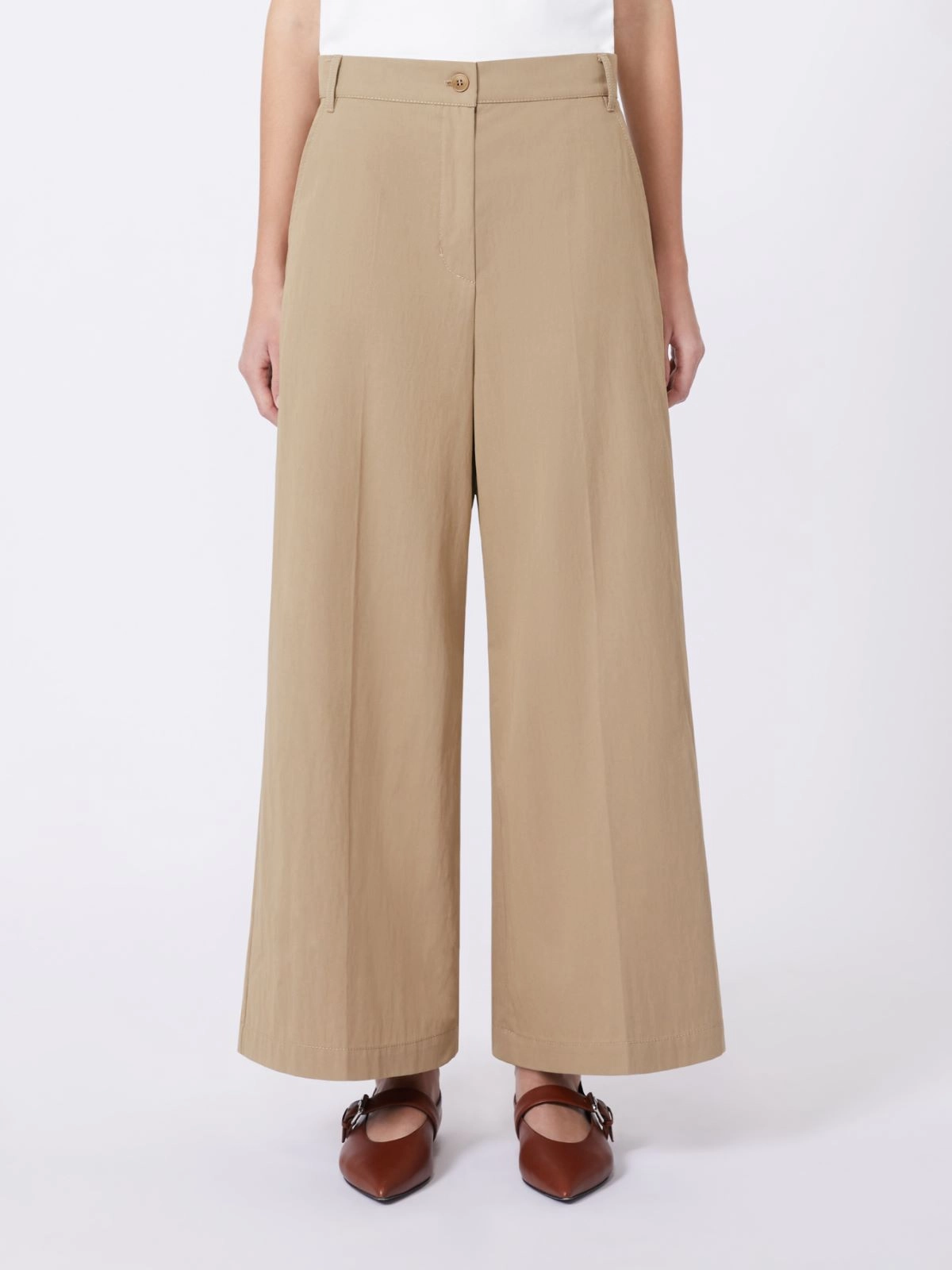 Pantalone wide leg con taglio cropped alla caviglia e piega stirata.
